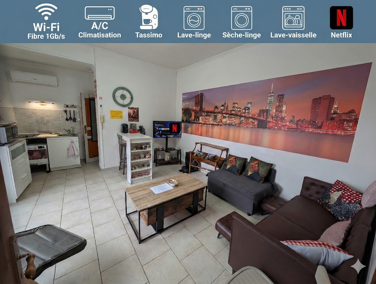 Dans une décoration chaleureuse, retrouvez un séjour ouvert et cosy, une cuisine équipée, une chambre séparée comprenant un grand lit confortable (bonne nuit garantie grâce au volet), une salle de bain ouverte avec douche massante et vasque, et toilettes séparées. A l'extérieur, parking privatif fermé, donnant sur un jardin verdoyant avec salon et à l'arrière, une cour isolée avec barbecue et espace repas extérieur !