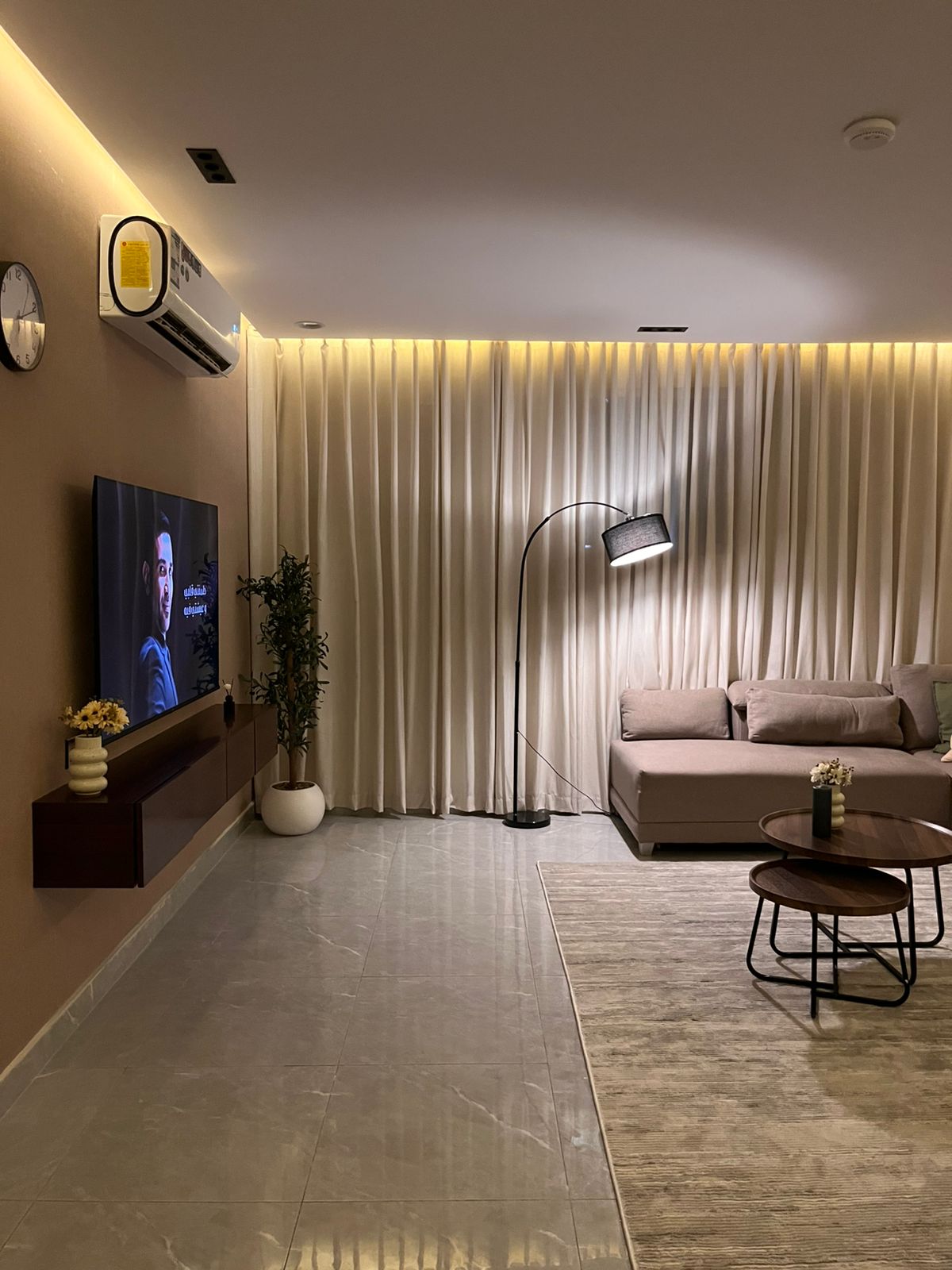 Apartament znajduje się w jednej z najbardziej ekskluzywnych dzielnic północnego Rijadu, dzielnicy Al-Rabie, i został zaprojektowany z najnowszymi luksusowymi meblami. Zawiera 75-calowy inteligentny ekran, ultraszybki internet i ekspres do kawy Nespresso. Apartament ma własne wejście i całkowitą prywatność. Przed kompleksem znajduje się promenada, 15 minut od Riyadh Boulevard, 10 minut od centrum finansowego King Abdullah i 15 minut od międzynarodowego lotniska King Khalid bez zatrzymywania się przed jakimkolwiek sygnalizacją świetlną A także subskrypcja (NETFLIX - Shahid) Dostęp dla gości Samodzielne zameldowanie
