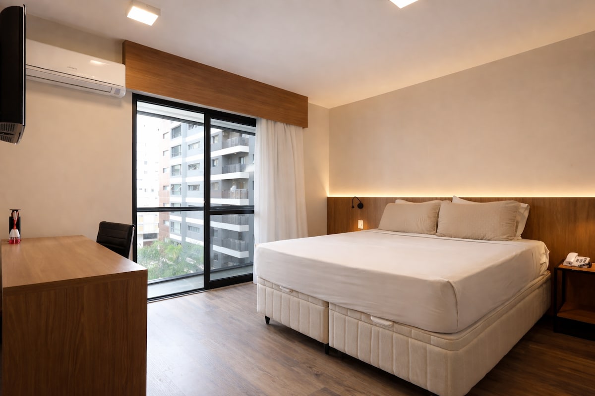 Welcome to your retreat in Jardins, one of São Paulo’s most upscale neighborhoods. ✅ Prime location near Avenida Paulista, with easy access to shopping malls, renowned restaurants, parks, and metro stations. ✅ Modern and cozy space designed for comfort and practicality. ✅ Comfortable bed, air conditioning, Wi-Fi, cable TV, equipped compact kitchen, and workspace.