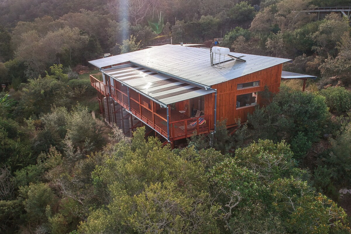 Ten stylowy dom z własnym wyżywieniem, z widokiem na ocean i lagunę, położony jest w rezerwacie ptaków na zalesionym wzgórzu, 5 minut jazdy od dziewiczych plaż i centrum Wilderness. Oferuje on przestronne pokoje dzienne i jadalnie, taras z podgrzewanym basenem, 3 sypialnie z łazienkami oraz prywatne tarasy z widokiem na morze i las. Udogodnienia obejmują domową siłownię, sprzęt do pilatesu, grill Weber, telewizor Smart TV 75”, pełny pakiet DSTV, Play Station 4, stół do piłkarzyków i nieograniczone Wi-Fi.