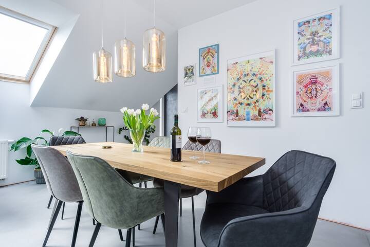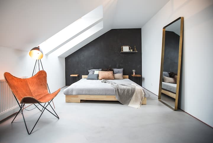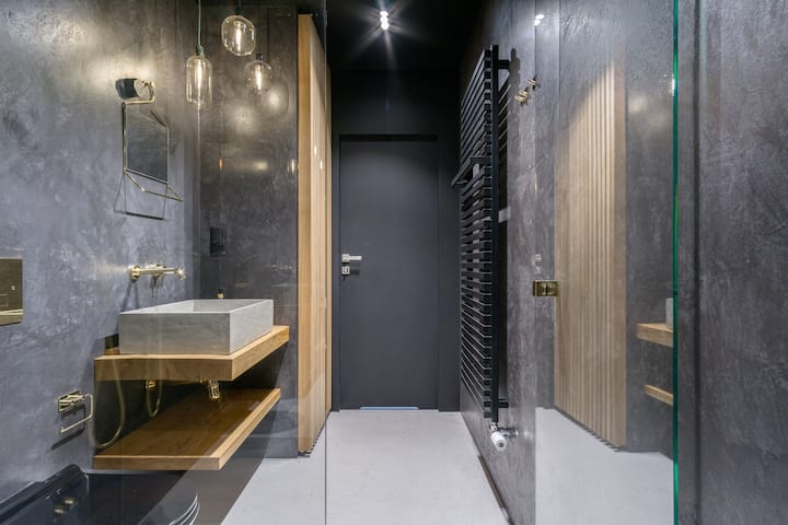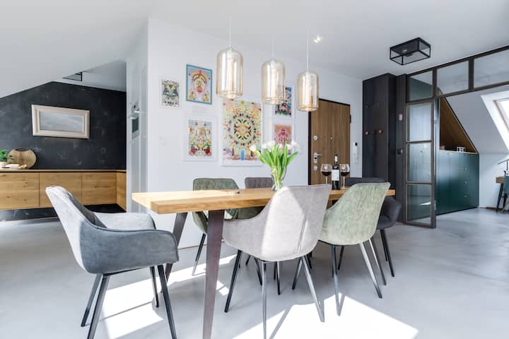Apartament szczyci się skandynawskim stylem najwyższego standardu: poczuciem designu, jakością widoczną w każdym elemencie oraz meblami na zamówienie lokalnych rzemieślników. Zwróciliśmy dużą uwagę na każdy szczegół, co zaowocowało unikalnym połączeniem betonu, dębu, miedzi, złota i kolaży lokalnego artysty.