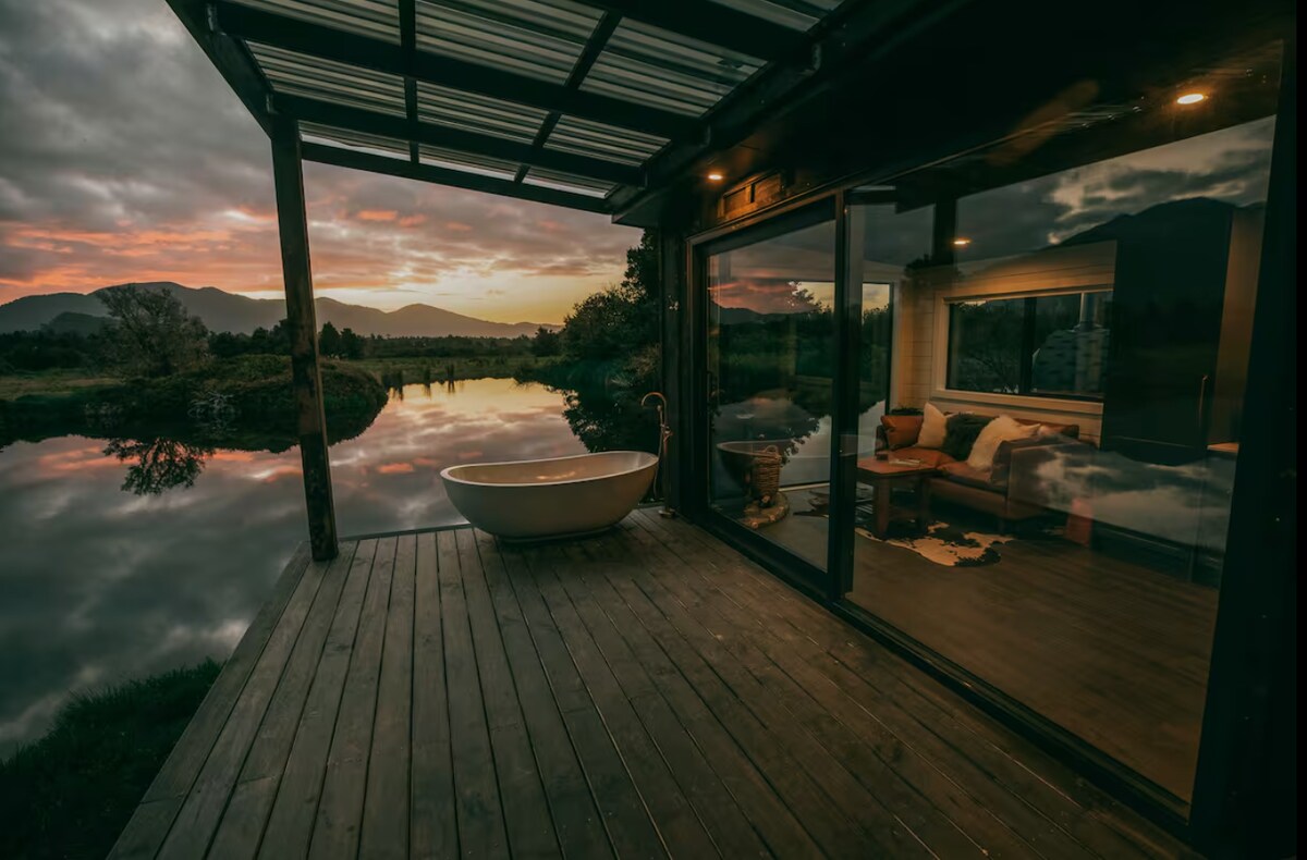 Luksusowa chatka na odludziu w dzikiej przyrodzie położona na brzegu małego jeziora zasilanego przez nieskazitelny górski strumień, 3 minuty jazdy od wioski Franz Josef Glacier. Sensacyjne widoki na ośnieżone góry, jezioro, lodowiec, Fritz Falls i las deszczowy. Łóżko typu Super King, zachody słońca, kamienna wanna na świeżym powietrzu, cedrowa sauna beczkowa z panoramicznym oknem i naturalny basen na wyciągnięcie ręki. Poczuj luksus na łonie przyrody.