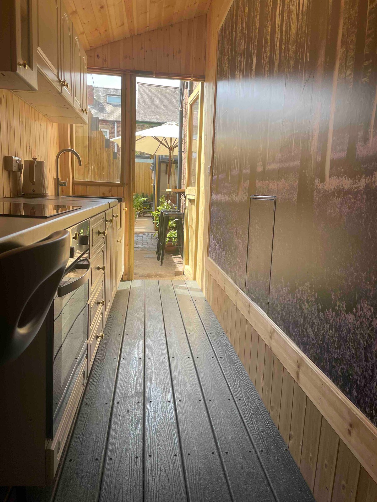 Park on the drive and enter the galley kitchen that leads to a garden oasis, designed for peace and tranquility. Walk across the courtyard with outdoor dining table and enter the cabin which has a bedroom with en-suite and lounge. This is an indoor / outdoor dining experience as well as enjoyment from evenings out in the local restaurants and pubs. There are local walks 15 minutes away. Set back from Green Lane which can be a little busy at certain times of the day.