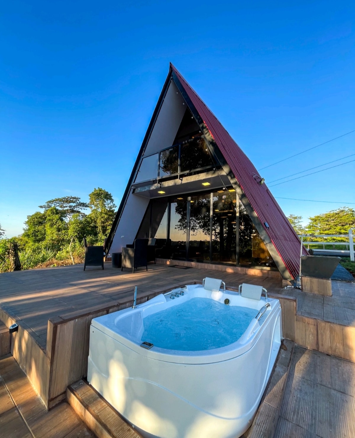 Welcome to the Coffee Cabins. This is one of four stunning A-frame cabins perched on the side of a mountain in the middle of a coffee field. You’re literally surrounded by coffee, both on the trees and in your kitchen with the complimentary coffee grown right here on the farm. Enjoy larger than life views to both the north towards the continental divide and to the west framing Volcan Baru, Panama’s highest peak.