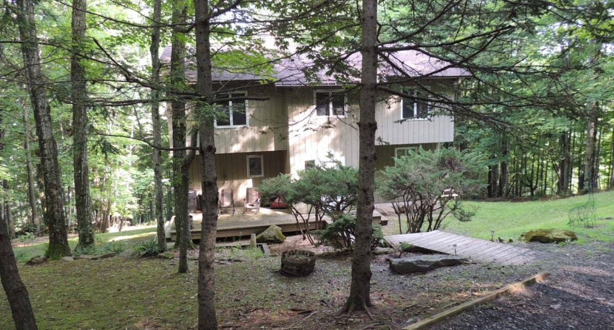 Ten domek w Catskill znajduje się na 12 odosobnionych akrach z wspaniałymi widokami na góry i doliny. Główny dom ma trzy dobrze wyposażone piętra z dwiema sypialniami na dole, główną sypialnią z łazienką na najwyższym piętrze i piecem opalanym drewnem na parterze. Na terenie posesji znajduje się również oddzielne studio z dużym kamiennym patio, paleniskiem, cedrową wanną z hydromasażem, stawem i malowniczym leśnym szlakiem. W pobliżu można jeździć na nartach, wędrować i grać w golfa!