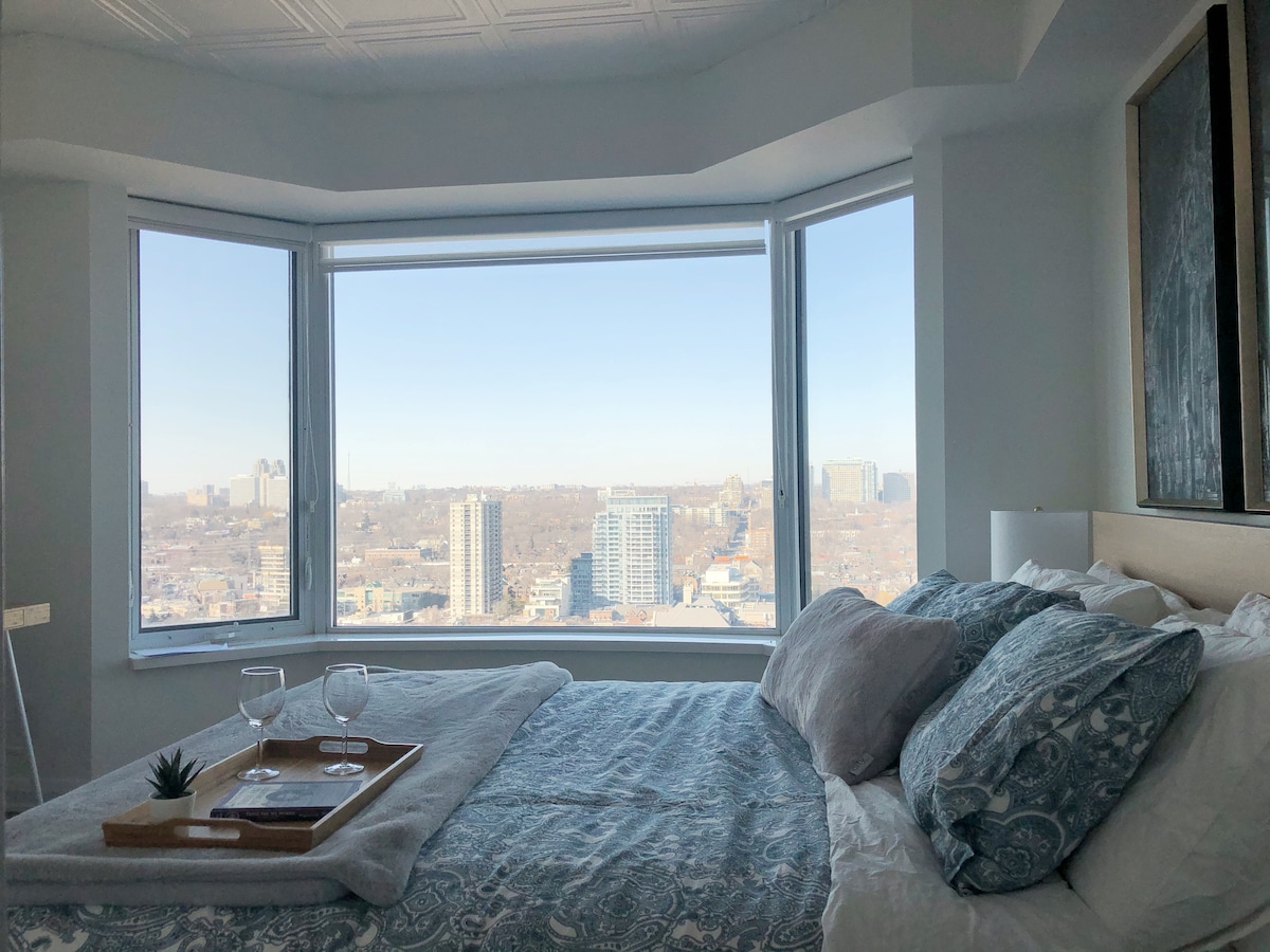 Ten apartament na najwyższym piętrze w Yorkville ma nieprzerwany widok na Yorkville z łóżka typu Queen w głównej sypialni. Kilka kroków od kampusu UofT i mniej niż 5 minut spacerem od 3 przystanków metra. Luksusowe zakupy i sklepy, takie jak Whole Foods, Louis Vuitton, Holt Renfrew, Nespresso, Dolce+Gabbana, Tiffany na wyciągnięcie ręki. Idealne na wyjazd służbowy lub wypoczynek. Budynek posiada siłownię na 3 piętrze. Apartament może pomieścić maksymalnie 4 osoby w 2 pokojach. Rozkładana sofa w salonie.