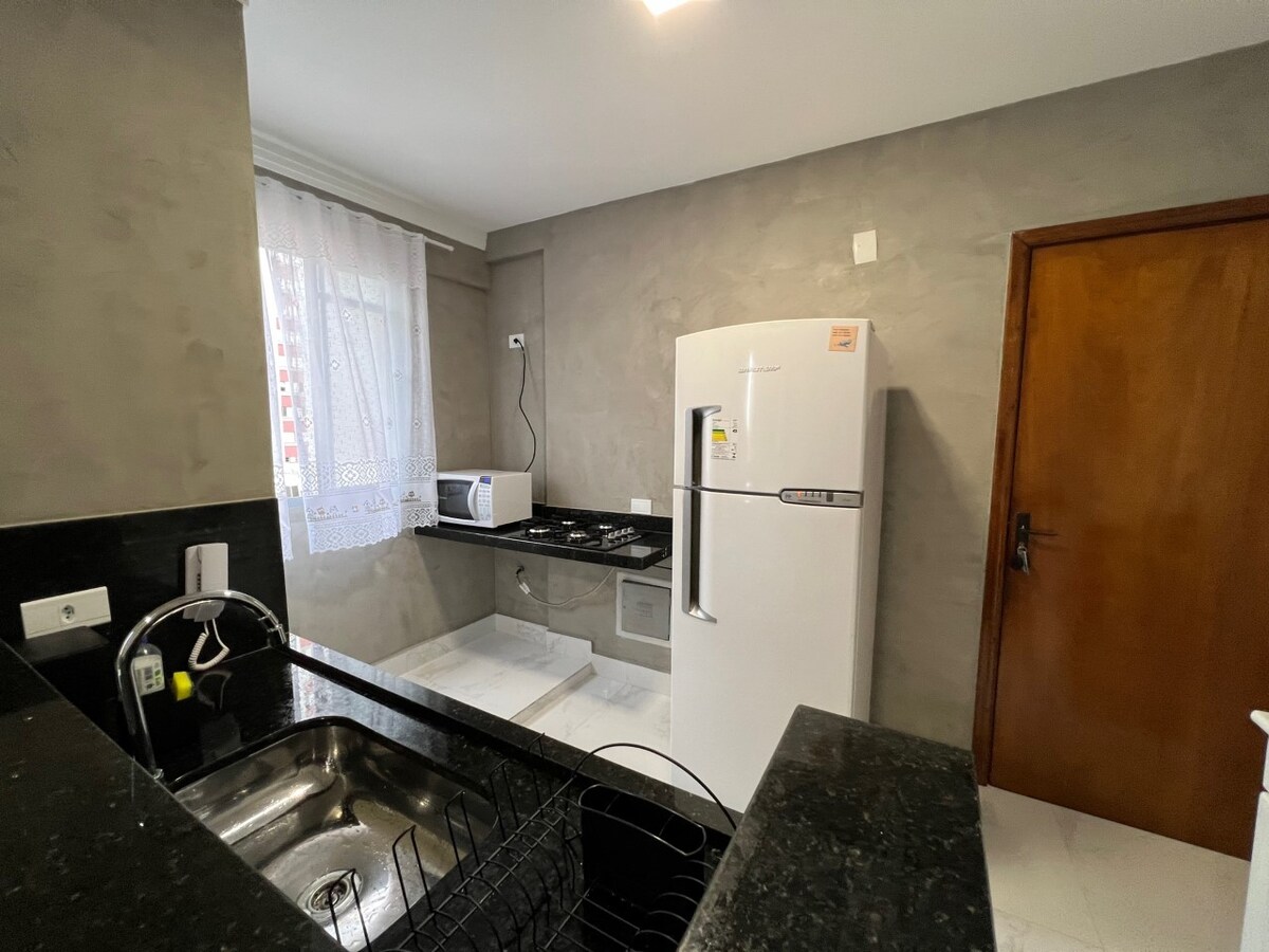 Studio localizado no centro da cidade, em uma área nobre, próximo a comércios, bares, restaurantes, farmácias e grandes avenidas. Com ar condicionado, cozinha completa com geladeira, fogão, microondas, cafeteira elétrica e sanduicheira. Smart tv com globoglay, Wi-fi e secador de cabelo! Na cobertura o hóspede terá acesso a piscina e academia. No térreo ao coworking e a um minimercado. Portaria 24 hrs com garagem.