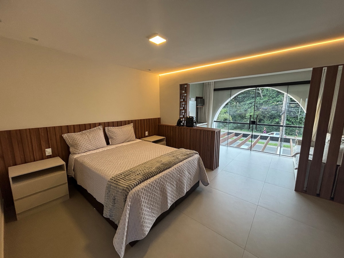 Witamy w Onda Lofts, Twoim nowoczesnym schronieniu w Armação dos Búzios! Nasza centralna lokalizacja, zaledwie 2 minuty spacerem od słynnej Rua das Pedras i pięknych plaż, oferuje najlepsze, co miasto ma do zaoferowania. Duże i nowoczesne lofty dwuosobowe zostały zaprojektowane z myślą o komforcie i praktyczności. Każdy nowo wybudowany apartament posiada kuchnię i prywatny balkon, idealny do relaksu i łączący loft z otwartą przestrzenią. *Nie świadczymy usług hotelarskich*