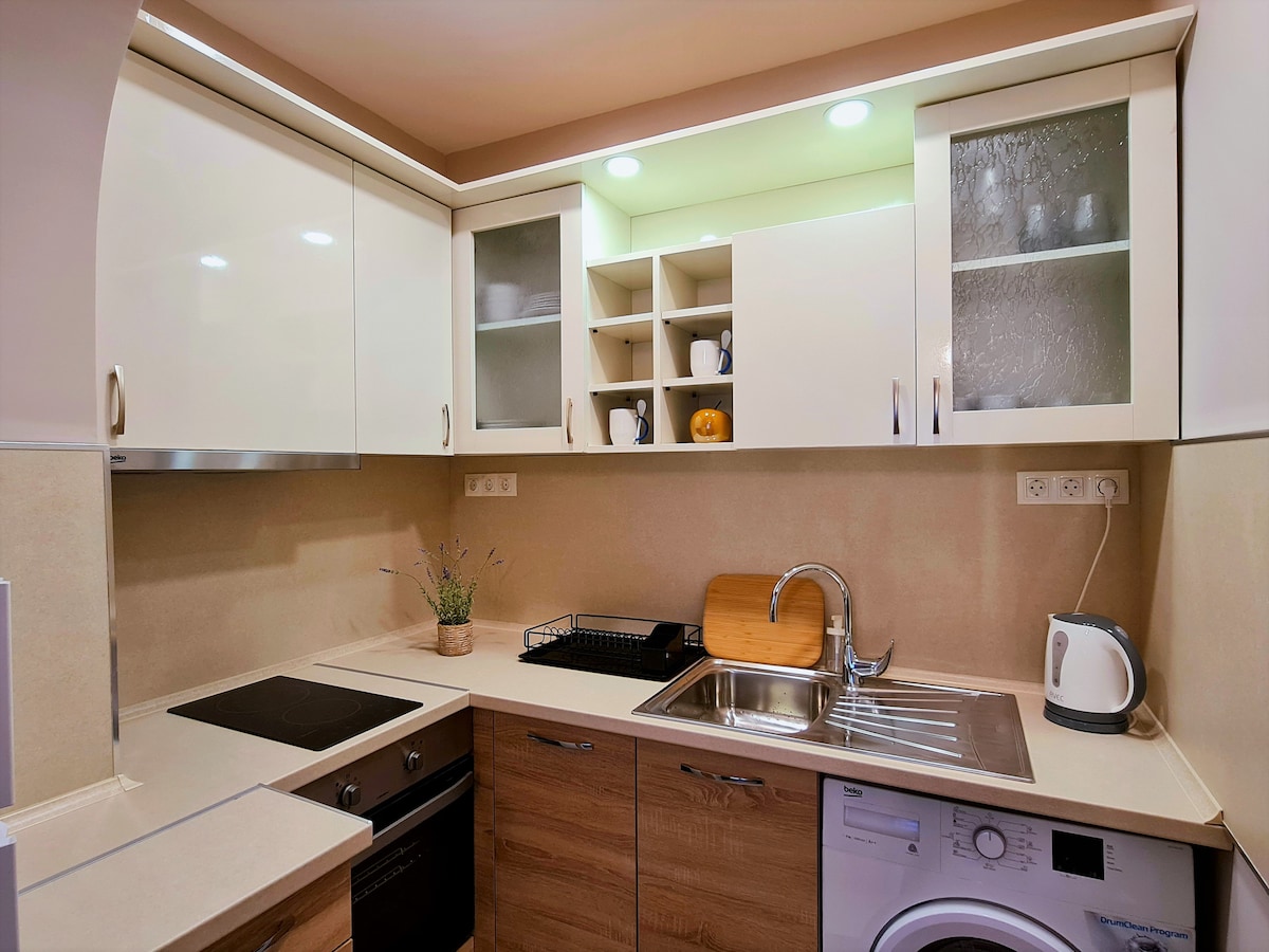 Stylowy apartament w centrum z pięknym widokiem na miasto | 2 sypialnie + balkon | Warna Witamy w EpiCenter Varna – Twoim stylowym 2-pokojowym miejscu na wypoczynek w sercu miasta! Nasze mieszkanie o powierzchni 58 m² ma bezkonkurencyjną lokalizację, przytulny salon, w pełni wyposażoną kuchnię, balkon z widokiem, nowoczesną łazienkę i szybkie Wi-Fi. Zaledwie kilka kroków od Sea Garden, plaży, restauracji, sklepów i nocnego życia. Idealne dla par lub rodzin szukających wygody i komfortu.