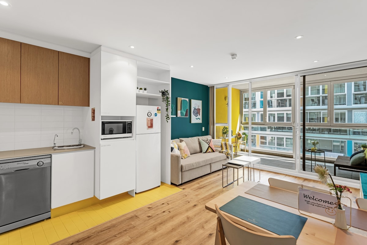 Completely renovated and fully self-contained one bedroom apartment has all the comforts of home. Situated on the 3rd floor of this heritage building from 1911 there is lift access, a rooftop terrace and a communal laundry with coin operated washers and dryers (laundry liquid supplied). In the huge bedroom is a full king size bed with bedside lamps incorporating USB ports, and a single bed. The lounge contains a leather sofa. There is a built in robe, lofty ceilings and downlights.