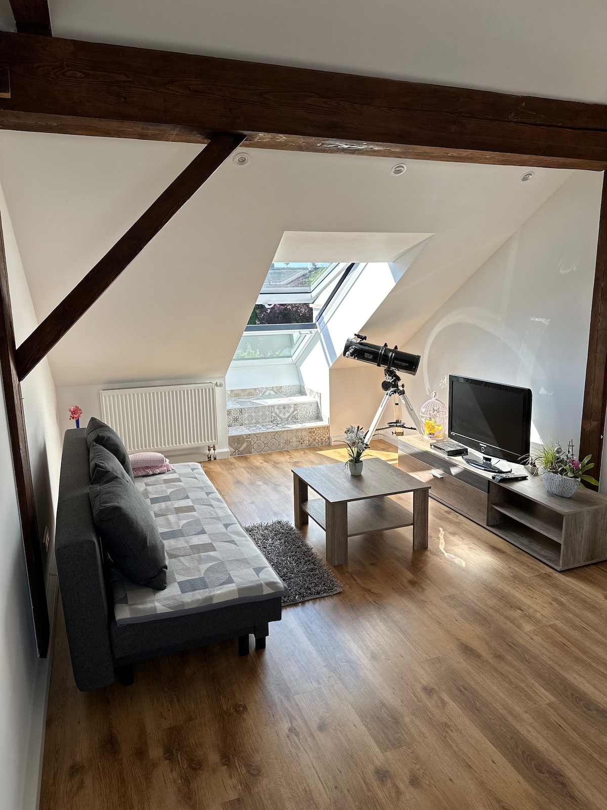 Witaj w swoim tymczasowym domu! Nasz jasny apartament na poddaszu z dużym balkonem łączy komfort i nowoczesny design. Niezależnie od tego, czy to wakacje, czy podróż służbowa, od razu poczujesz się tu jak w domu. Nowoczesna kuchnia zaprasza do wspólnego gotowania, balkon do kawy, słońca i relaksu. Przy stole do piłkarzyków czeka zabawa dla wszystkich grup wiekowych. Otwarte przestrzenie, dużo światła i przytulna atmosfera sprawiają, że apartament jest wyjątkowy. Może pomieścić do 4 osób dorosłych i 1 małe dziecko.