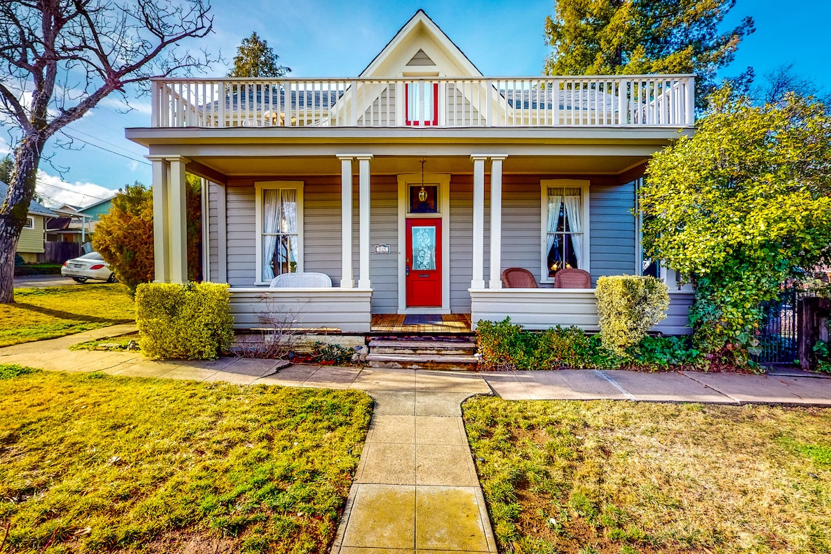An enchanted stay awaits at this charming two-story home, which showcases a stunning backyard straight out of the pages of a storybook. Completely fenced, this outdoor oasis creates a whimsical vibe with wisteria, a giant redwood, and gorgeous landscaping. At night, twinkling lights strung up by a central pole only add to the magic. Enjoy grilling out, cozying up by the gas firepit, or simply relaxing amid the picture-perfect backdrop.