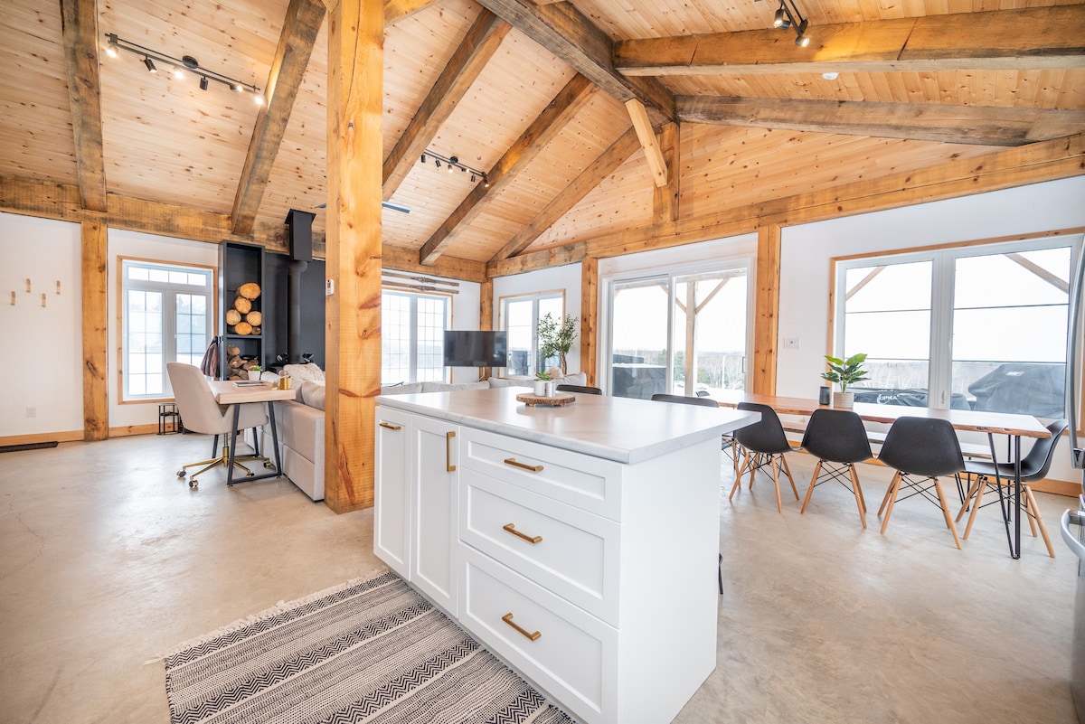 Escape to The Timber Oasis. A custom-built timber-frame retreat with floor-to-ceiling windows on 4 private acres of valley views. The Highlights: 🌲 5 mins to Lake Clear 🛁 Private covered Jacuzzi® Hot Tub 🔥 Cozy wood stove + outdoor fire pit 🛌 Sleeps 6: 2 BRs w/ Queen-over-Queen bunks 🐾 Pet Friendly 🛜 100+ Mbps WiFi Enjoy a gourmet kitchen, in-floor heat, and a massive deck. Perfect for families, friends, or a quiet workation. Handcrafted luxury meets nature. Book your stay!
