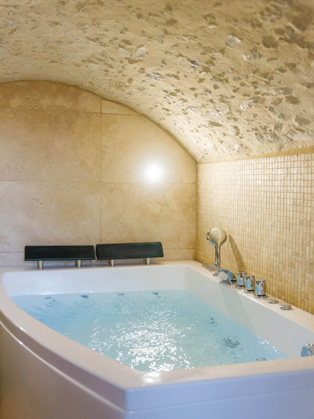 Idealne zakwaterowanie zarówno zimą, jak i latem Prywatna sauna i balneoterapia (wewnątrz) Strefa spa została stworzona pod kamieniem w miejscu dawnej piwnicy na wino. Jedno pomieszczenie przeznaczono na strefę relaksu z terapią światłem, sauną i dwiema dużymi pufami do relaksu. Sauna to prawdziwa sauna skandynawska z piecem na gorące kamienie w środku. W salonie znajduje się również piękny piec na drewno na zimowe noce.