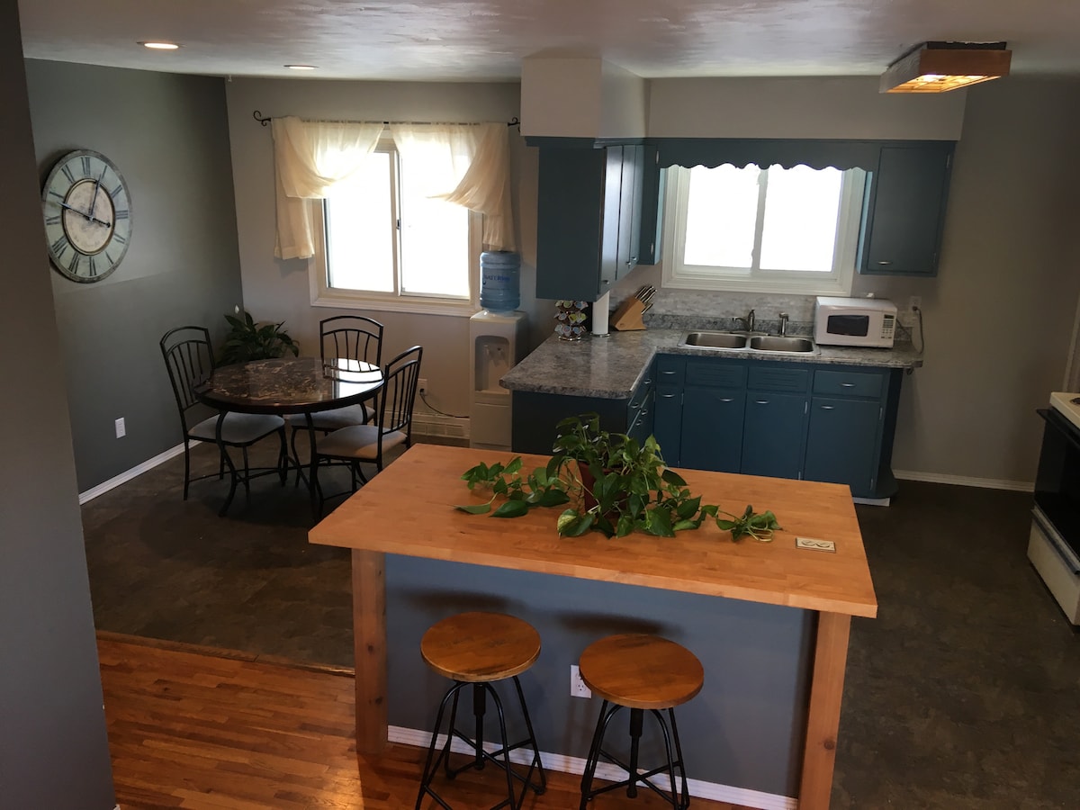 Cicha prywatna sypialnia i aneks kuchenny odizolowane od głównego domu ze wspólnym pokojem słonecznym pomiędzy. Wiejskie położenie przy autostradzie 44, zaledwie kilka minut od lotniska Rapid City. Gniazdo ładowania Tesla 11kw w garażu dostępne bezpośrednio z apartamentu. Internet Starlink 150 mb/s. Przyjazne dla zwierząt domowych z drzwiami dla zwierząt z apartamentu na ogrodzone podwórko i patio odizolowane od naszego psa i kota. Prywatna łazienka ma ogrzewanie podłogowe i niekończącą się gorącą wodę z podgrzewaczem wody o ciągłym przepływie.