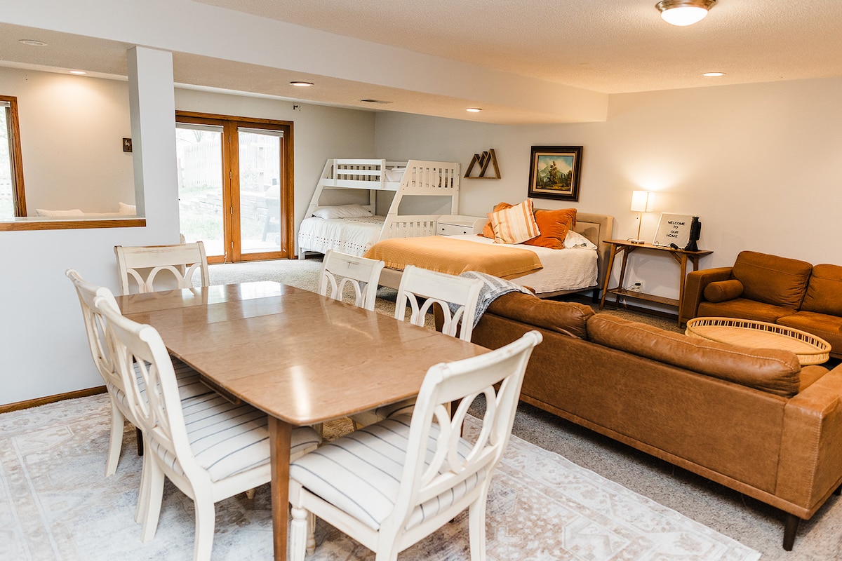 Nasz przytulny, cichy dom znajduje się na szlaku spacerowym, potoku i prerii. Łatwy dostęp do autostrady międzystanowej, restauracji i sklepów. Masz prywatny dostęp do naszej piwnicy z sypialnią, salonem, łazienką i aneksem kuchennym, + gry planszowe, książki, ping pong, nasze podwórko i pobliski park. Sypialnia ma łóżko typu Cal King i ciemne, chłodne miejsce do spania. W pokoju rodzinnym znajdują się dwa podwójne łóżka i podwójny materac na podłodze, a także nasza duża wygodna sofa i okna od podłogi do sufitu, które prezentują naszą zieloną przestrzeń.