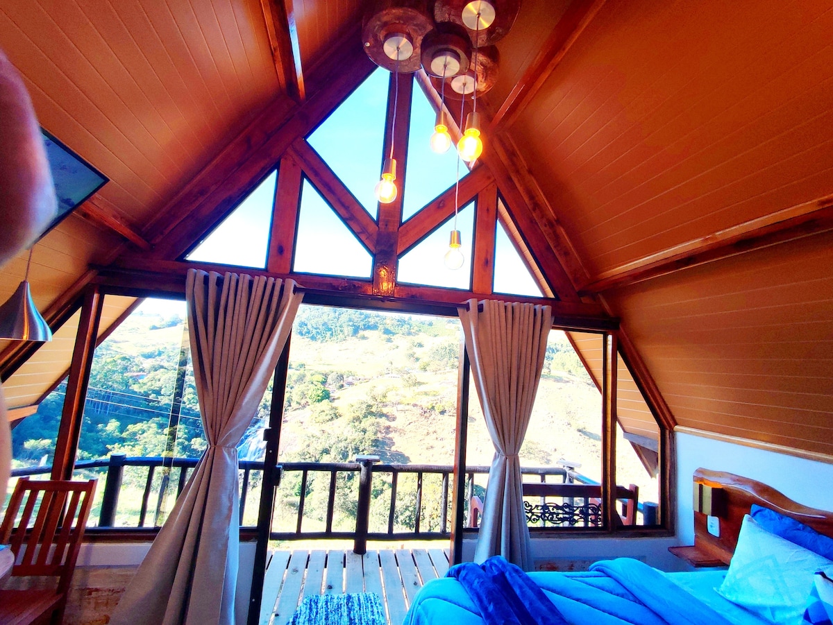 Refúgio romântico em meio à natureza, ideal para casais. Chalé estilo suíço (A-frame) em sítio cercado por cafezais, com rio e cachoeira particulares. Possui banheiras externas com vista para a Serra da Mantiqueira, jacuzzi interna, fogueira, churrasqueira, quadra de beach tênis, cama-balanço, sauna seca com vista e projetor interno com telão de 100”.