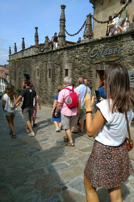 Wyjątkowy apartament 52 m2, z 1 kuchnia-sola z rozkładaną sofą 1,35, 1 sypialnia z łóżkiem 1,35 z.1 łazienka z prysznicem i bardzo jasna galeria, tuż przy ulicy wejściowej do pielgrzymów do miasta.Spektakularna ulica dla życia i radości w ciągu dnia i nocy.Ale odpocząć bez przeszkadzania nam w ogóle, mieszkanie ma pokój z tyłu budynku.Jest to 3 na klatce schodowej