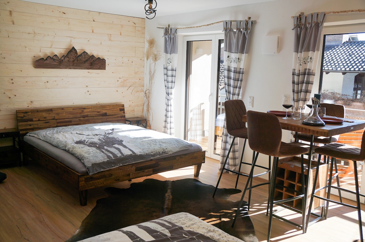 78 m² apartament z 2 pokojami w „Haus der Begegnungen” oferuje miejsce na przytulne wakacje dla rodzin/par, przyjaciół i osób podróżujących służbowo. Oprócz oddzielnej sypialni znajduje się salon z podwójną rozkładaną sofą (telewizor, kominek, dostęp do kuchni). Kuchnia posiada podstawowe wyposażenie (+ zmywarka, lodówka) oraz typowo bawarską część wypoczynkową. Łazienka wyposażona jest w dwie umywalki, prysznic, wannę, toaletę i bidet. Na górze znajduje się mini balkon.