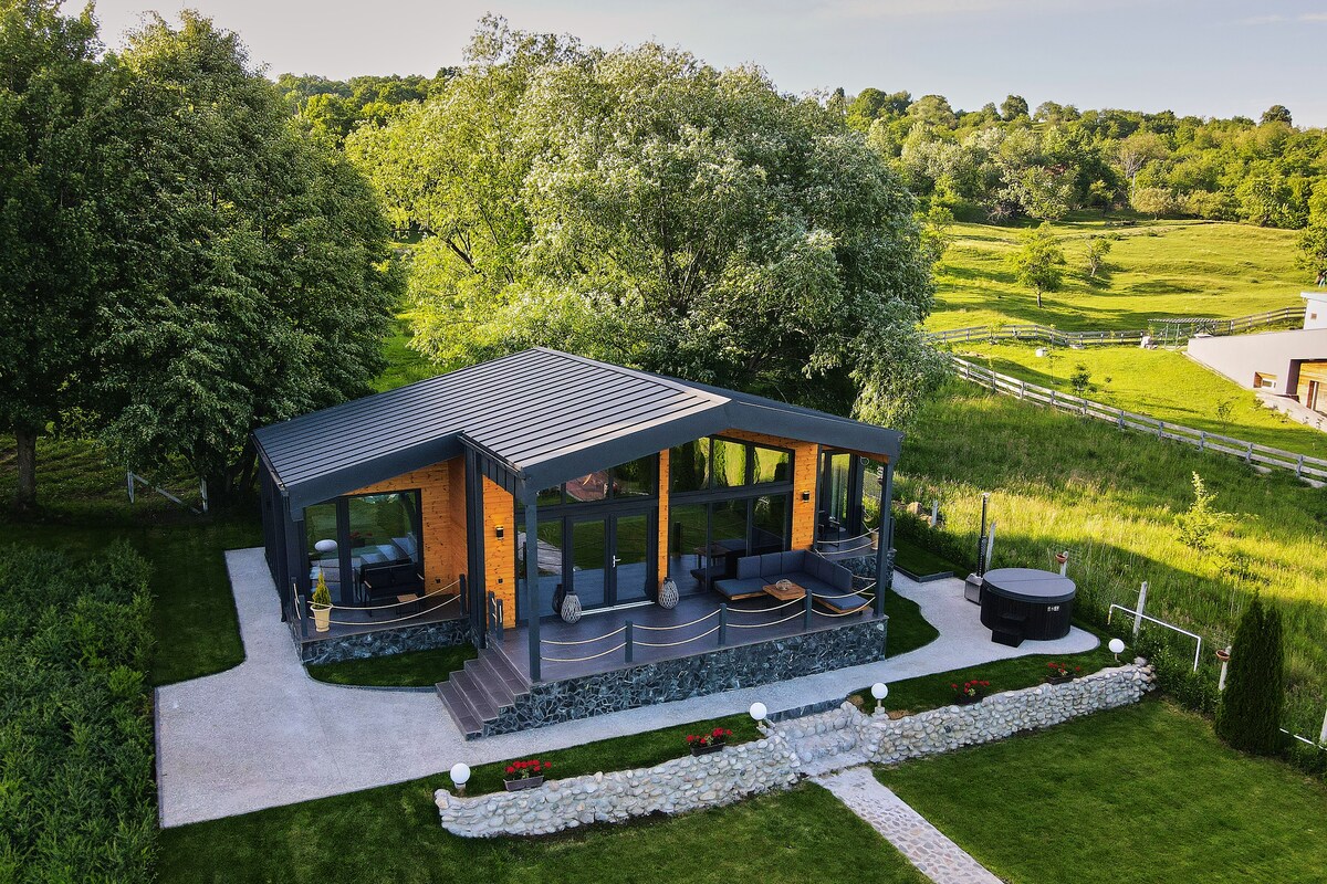A brand new A-Frame Cabin located near Sibiu in the heart of Transylvania is waiting for you to enjoy it! It has 2 bedrooms with private bathroom, a large living room with a fully equipped kitchen, a big terrace with comfortable lounge and barbecue and a hot tube. Kick back and relax in this calm, stylish space.