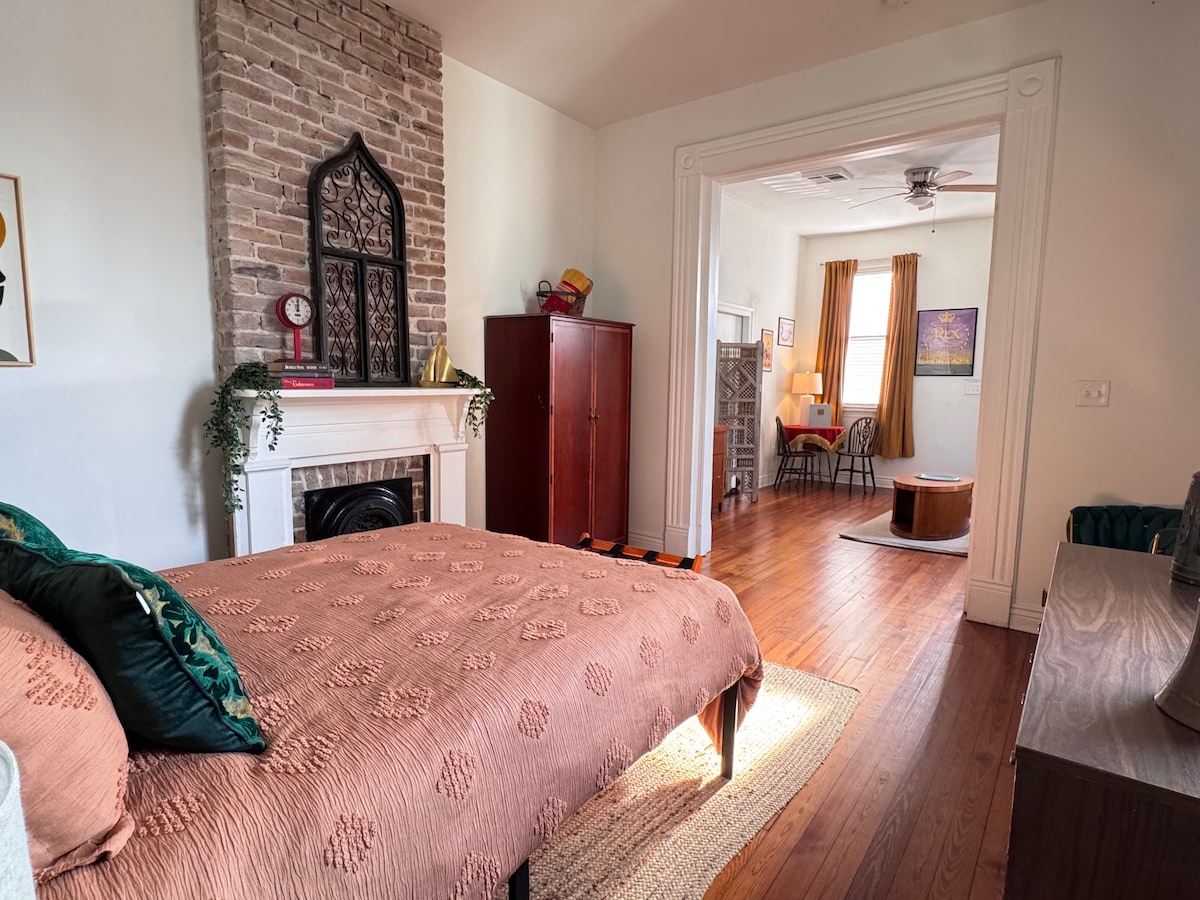 Wspaniały apartament dla dwóch osób, w odległości krótkiego spaceru od Frenchmen St. (3 minuty) i Dzielnicy Francuskiej (10 minut). Idealny dla osoby podróżującej w pojedynkę lub pary, ten komfortowy apartament w odnowionym pojedynczym shotgunie ma łóżko typu queen, kabinę prysznicową, aneks kuchenny w stylu retro (bez pełnej kuchni) i duży, wspólny taras na świeżym powietrzu. Miejsce ma wszystko, czego potrzebujesz, aby doświadczyć Nowego Orleanu jak bajeczny mieszkaniec. Składa się z sypialni, salonu i dużej łazienki.