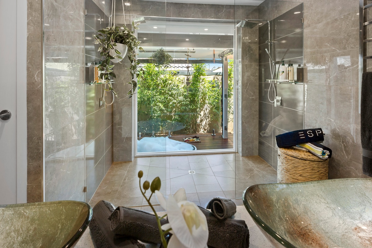 Chillax & unwind in the sunken double spa with overhead heating in your private courtyard & afterwards snuggle up in your 4 poster bed with the flickering stone clad double sided fire at your feet Indulge in the romantic, intimate double shower - LGBTQ+ friendly The perfect haven to spend an idyllic break after a Peninsula day out exploring. Serenity is only 3 minutes walk to fabulous Main St & 4 mins walk to the beaches Rejuvenate in your own private zen oasis for two (2) - you deserve it!