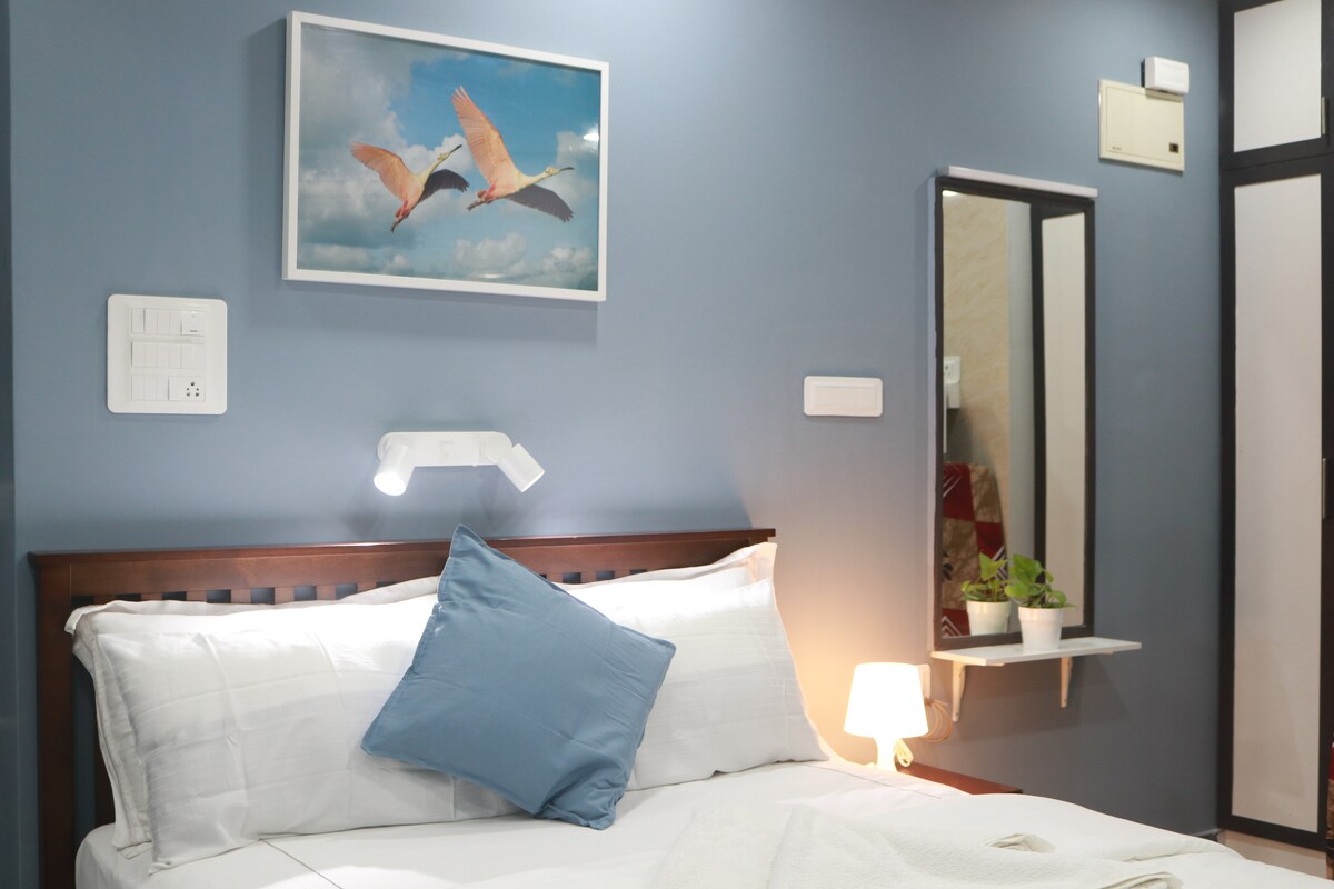 Obudź się i podziwiaj panoramę północnego Bangalore. Na 5. piętrze z widokiem na miasto 360°, z niezrównanym wiatrem, światłem i prywatnością. Ogromny prywatny balkon, pełen roślin, jest idealny na poranną kawę, rozmowy służbowe lub romantyczne kolacje pod gwiazdami. I tuż za rogiem? Kultowe The Café Buddha – najlepsze w mieście angielskie śniadanie i muzyka na żywo w weekendy. Niemiecki materac 12” zapewniający sen jak marzenie, przytulne miejsce do pracy z najlepszymi widokami i 55-calowy telewizor Smart TV Najlepsze do pracy, relaksu lub zwiedzania.