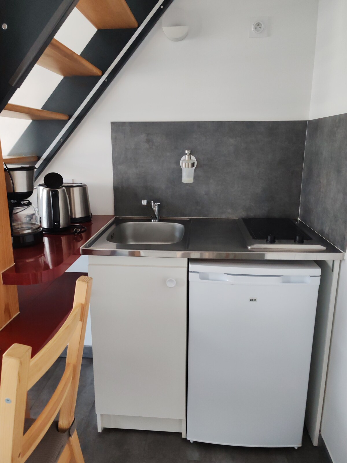 Apartament dwupoziomowy położony bardzo blisko morza (około 200 m), na dole znajduje się w pełni wyposażona aneks kuchenny i łazienka z prysznicem, połączone z piętrem schodami, które prowadzą do sypialni i strefyku wypoczynku/biurka. Niezależne wejście i prywatny parking. Mały ogród z tarasem, dostępny przez prywatny parking, od kwietnia do października. Wiata na rowery. Spokojna dzielnica mieszkaniowa w Saint Aubin sur Mer w pobliżu plaż lądowania i miasta Caen.