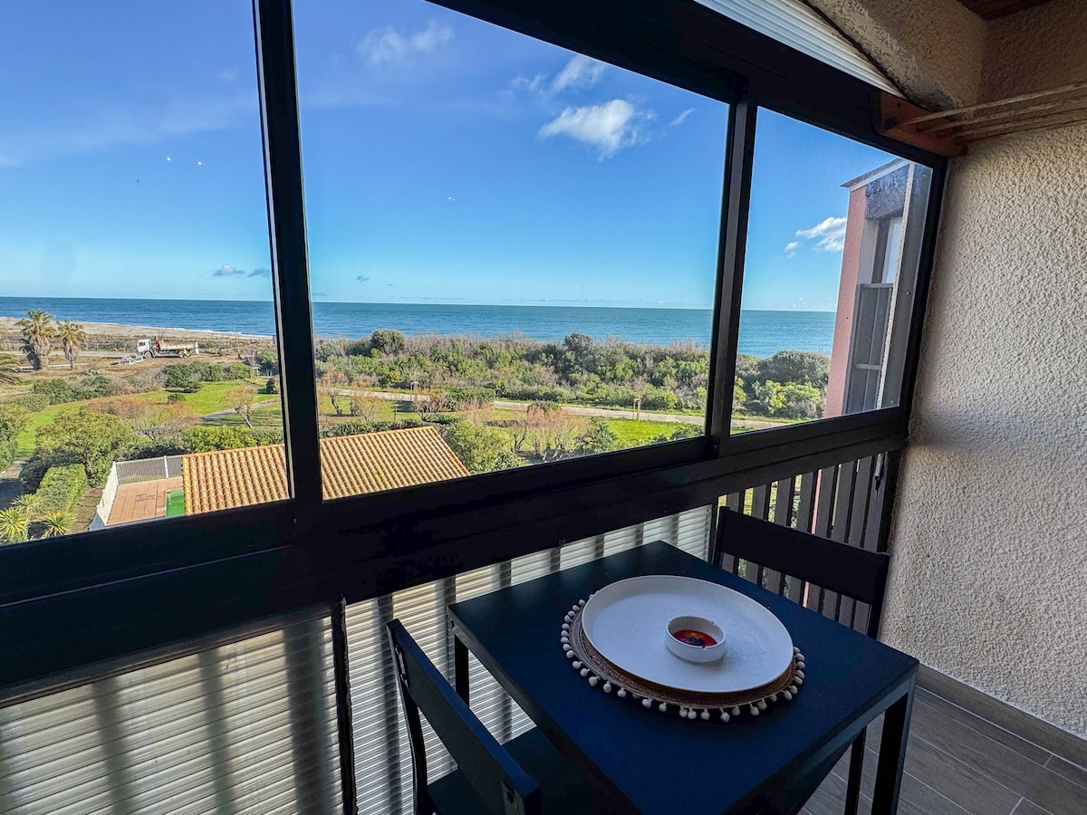 Odnowione! 2 sypialnie – 5 miejsc do spania – klimatyzacja – Wi-Fi – parking – 50 m od plaży Zatrzymaj się w tropikach, aby cieszyć się wyjątkową lokalizacją i widokiem na morze. ** Bezpośredni dostęp do plaży ** Nadzorowana i niezatłoczona plaża. – Oszałamiające widoki na Morze Śródziemne - Niesamowite wschody słońca - Basen czynny od czerwca do września - Bezpieczny parking.