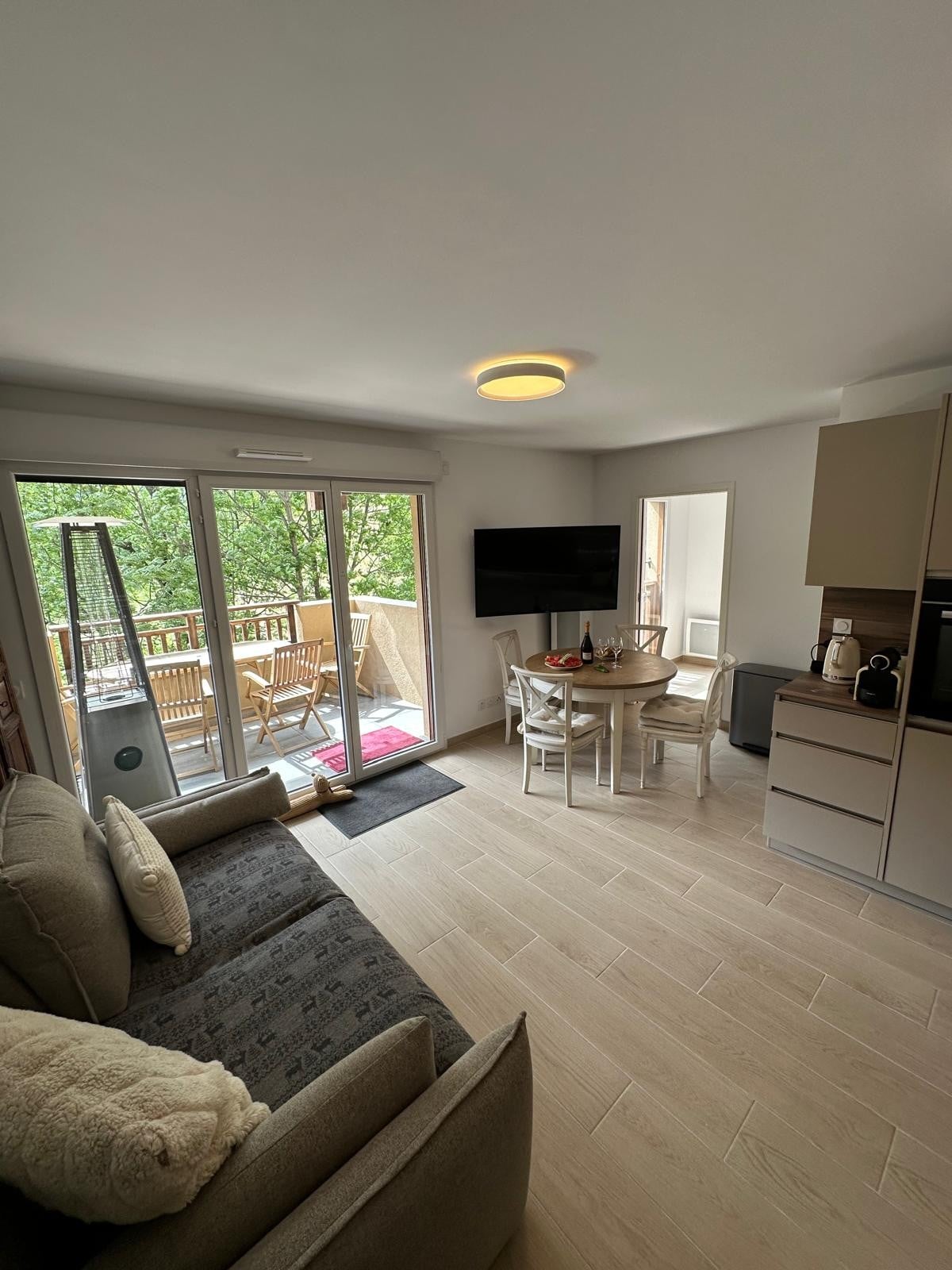 Apartament o powierzchni 40 m², z 3 gwiazdkami, w pełni wyposażony i nowy, położony w sercu wioski, ale w spokojnej okolicy, 200 metrów od głównego placu i 5 minut spacerem od kolejki linowej Pinatelle. Składa się z: 1 w pełni wyposażona kuchnia i jadalnia ze zmywarką, piekarnikiem, płytą indukcyjną, kuchenką mikrofalową, dużą lodówką i zamrażarką. 1 oddzielny salon z telewizorem, narożnikiem rozkładanym na podwójne łóżko, dużą szafą, pralką, suszarką itp. 1 pokój z podwójnym łóżkiem