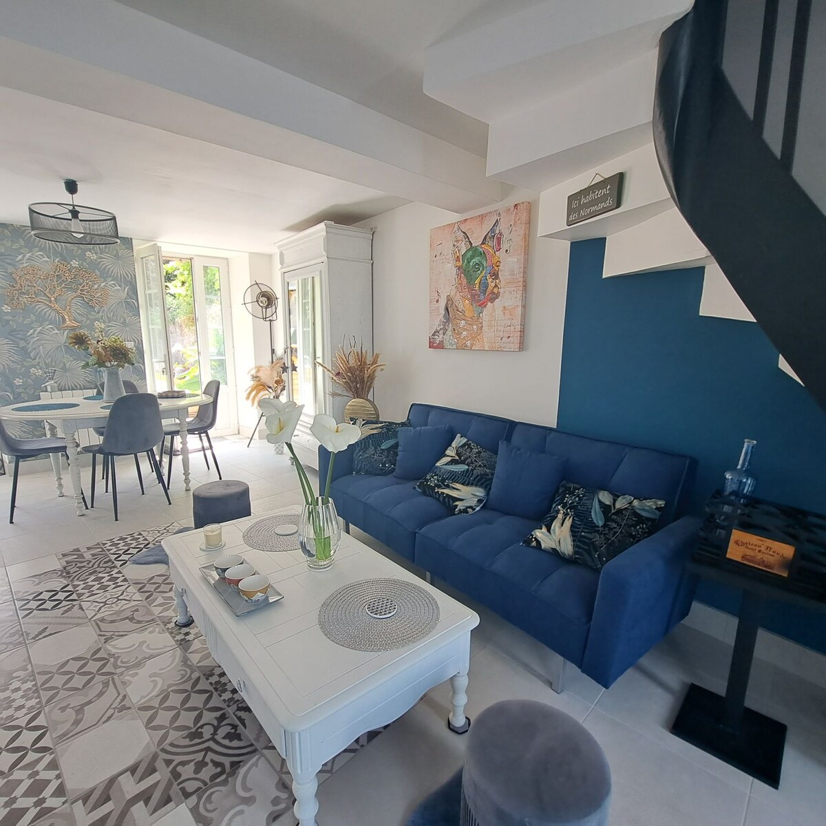 Oszałamiający dom w stylu shabby chic na wybrzeżu Cotentin, urządzony zgodnie z wysokimi standardami. Domek znajduje się na terenie dużej willi. Znajduje się w centrum bardzo małej wioski, w której znajduje się piekarnia, mały sklep spożywczy, kawiarnie i restauracje. To krótki spacer do plaży. To wygodna lokalizacja dla Mont St Michel i odkrywania granicy Bretanii/Normandii.