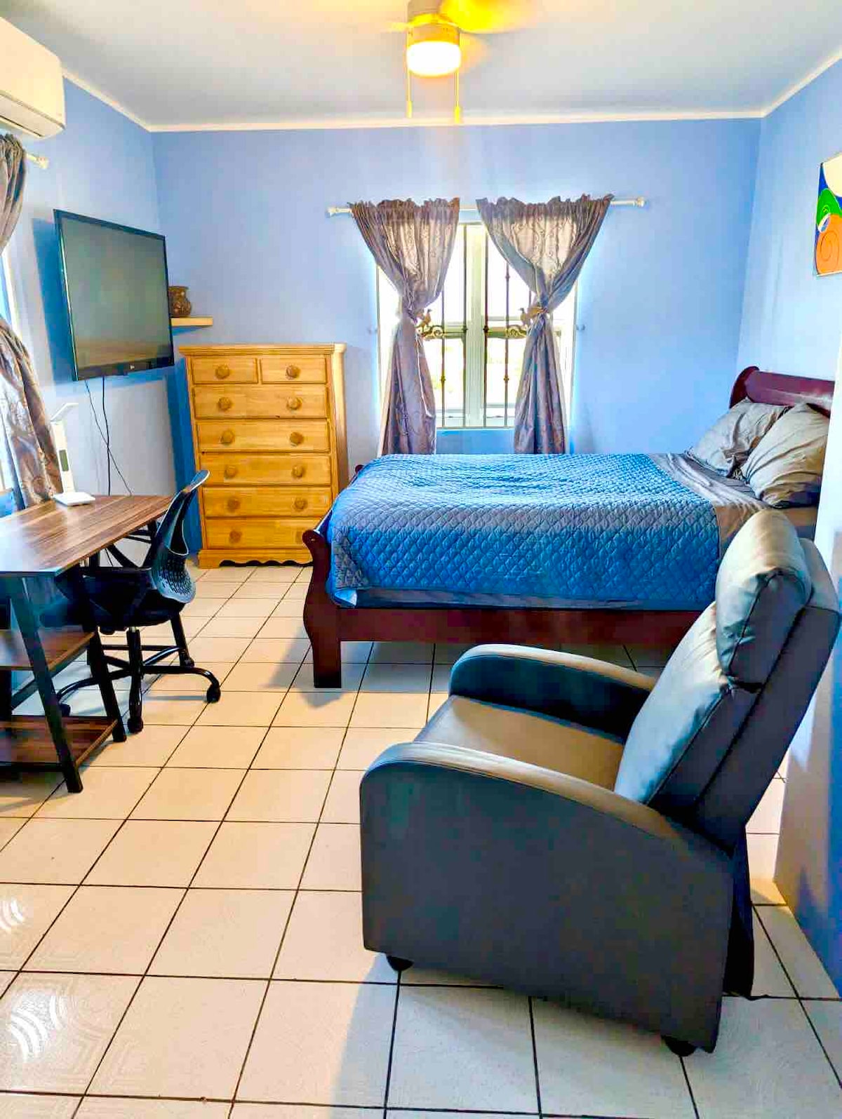 Spacious hilltop home just 10 minutes from the airport, ideal for families or groups. Enjoy 3 comfy bedrooms, a full kitchen, airy living room, and sweeping views from the breezy patio. You'll be 10 minutes from beaches, shops, and restaurants, yet tucked away enough to unwind. Self check-in, secure parking, and reliable AC make stays easy. It offers an effortless island base with real local comfort.