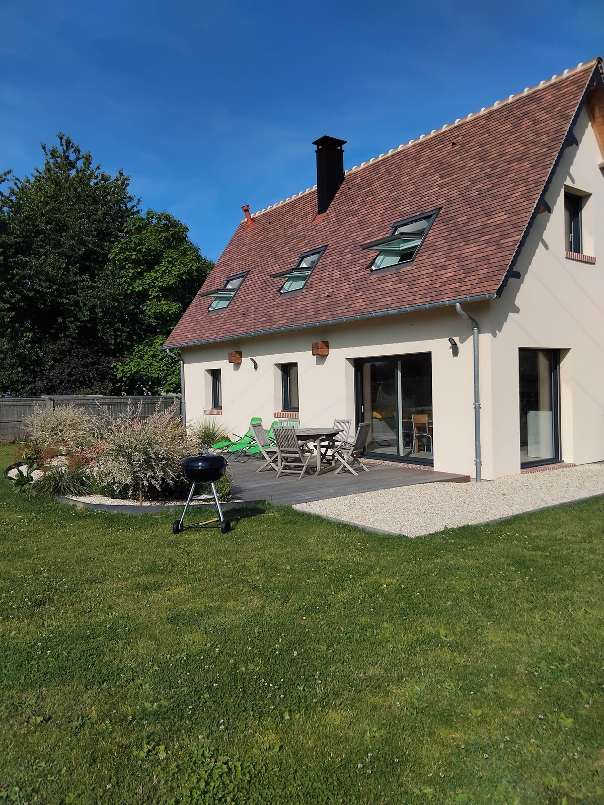 Maison familiale dans un jardin de 6000 m² avec partie boisée. Idéale pour un séjour en famille avec enfants ou vacances entre amis (capacité d’accueil maximale de 7 adultes ou enfants + 1 bébé) Cuisine équipée ouverte sur séjour avec salon et cheminée. Barbecue. Sous-sol complet et espace buanderie. Cabane de jardin dans laquelle les enfants peuvent aller Jeux de société et Jeux d'extérieur à disposition. A proximité de Beuzeville (10 mn), Honfleur (20 mn), Deauville-Trouville (30 mn)