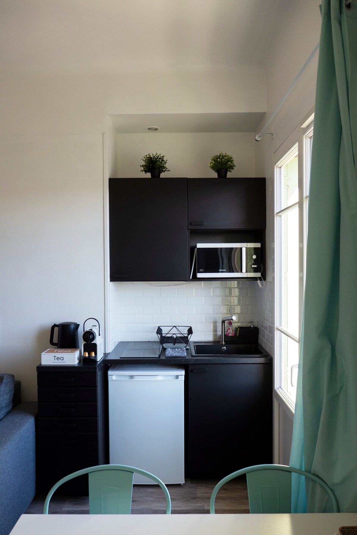 Zajmiesz to urocze odnowione studio o powierzchni około 26 m², z klimatyzacją i wentylatorem sufitowym, który jest bardzo przyjemny latem Główny pokój używany jako salon i sypialnia jest cichy i przestronny, wyposażony w telewizor i połączenie z internetem. Dzięki wysuwanemu łóżku część przestrzeni szybko i łatwo zamienia się w sypialnię Bardzo funkcjonalny i dobrze wyposażony aneks kuchenny uzupełnia zakwaterowanie, a także łazienkę
