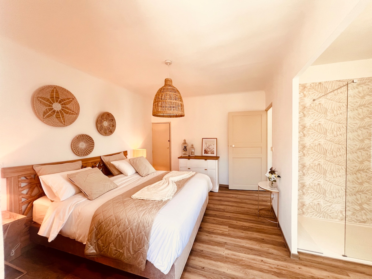 Welcome to our private oasis for 1 or 2 people in the heart of la roquette! Enjoy the heated salt water pool surrounded by tropical plants. The space will offer you a haven of shade and tranquility. Have breakfast, an aperitif, or cook poolside in the outdoor patio kitchen. The bedroom is air conditioned and equipped with luxury hotel quality bedding and organic linens, to ensure that your stay is relaxing and memorable.