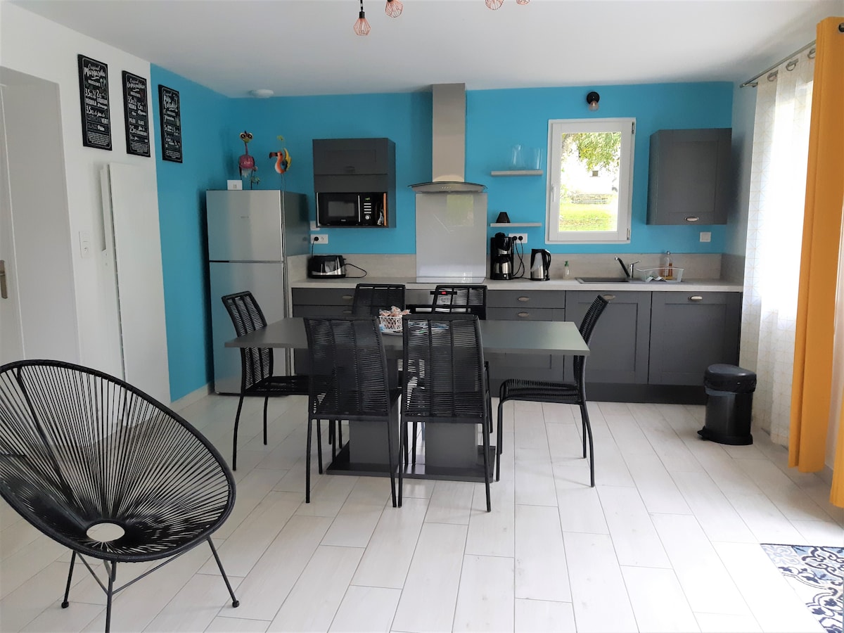 Dans son écrin de verdure le gîte propose un havre de paix à la campagne. La maison est indépendante dans une propriété équestre. Nous sommes au bout de la route, après c'est la campagne. Elle permet de se ressourcer loin de la circulation. La maison optimise l'espace et l'escalier est un peu raide. Malheureusement elle ne convient pas aux personnes à mobilité réduite. Avant de louer on doit toujours communiquer ici on est dans la réalité campagnarde et on se méfie du virtuel..