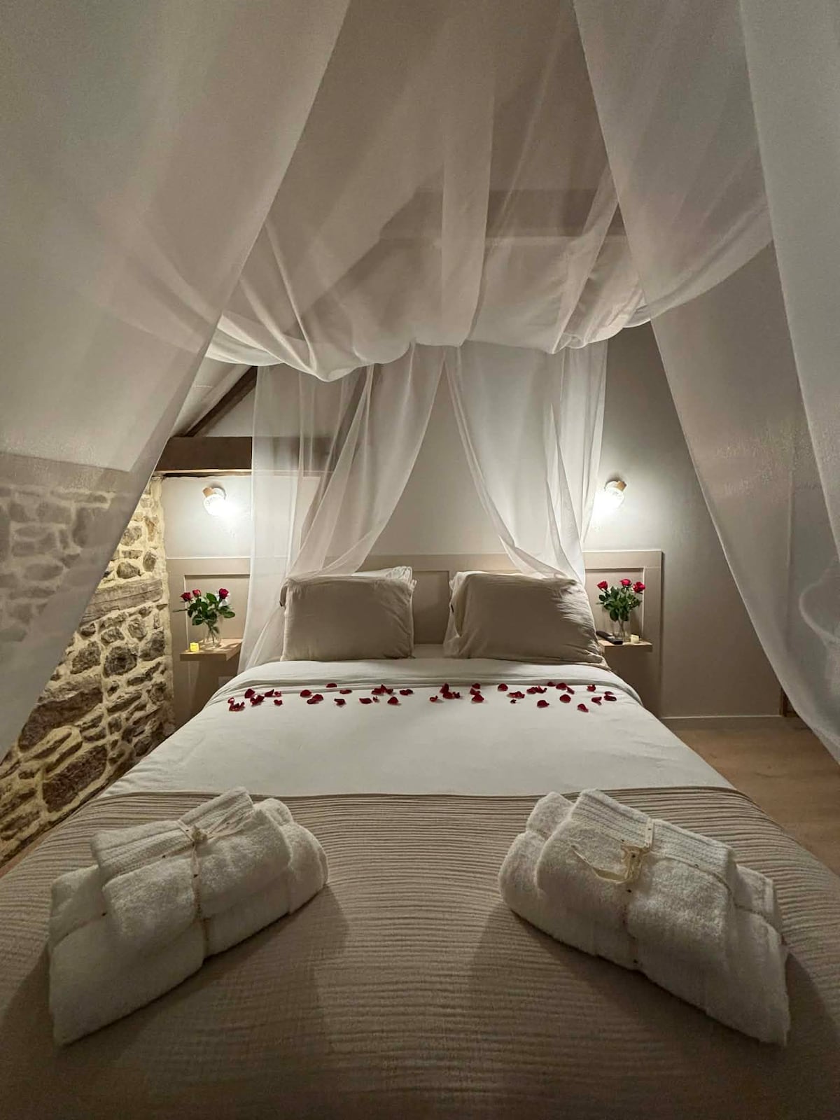 5-gwiazdkowy apartament turystyczny od 2024 roku, przeznaczony dla 2 osób Ta wysoka klasa jest gwarancją najwyższego poziomu komfortu i wyposażenia o bardzo wysokiej jakości. Dom na wsi, wyposażony i urządzony z dbałością o szczegóły, idealny na spokojny pobyt dla par lub rodzin. Chcieliśmy, aby był jasny, wygodny i nowoczesny, a jednocześnie zachował „stary” charakter z kamienną ścianą i kominkiem.