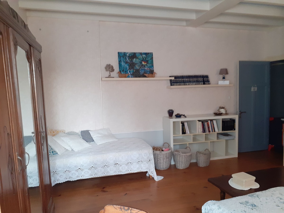Ciepła i spokojna sypialnia znajduje się w naszym rodzinnym kamiennym budynku. Ulica jest cicha, jasna i blisko do wszystkich udogodnień (sklepy, transport...) i zabytkowej dzielnicy. Wybierasz się na piękne spacery...! Z pokoju roztacza się widok na ogrody. Został ozdobiony z troską i miłością. Prywatna kabina prysznicowa z toaletami DARMOWA kawa, herbata, herbatniki i lodówka w pokoju Współdzielona, w pełni wyposażona kuchnia Szybkie Wi-Fi ! Bezpieczny parking w opcji