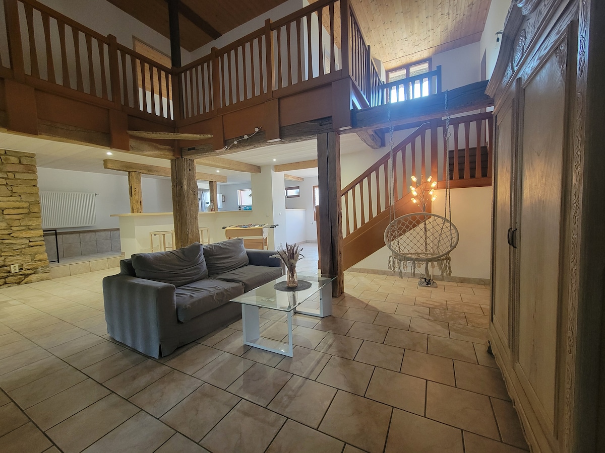 NOWOŚĆ W WYNAJMIE. Położony w samym sercu Bresse Bourguignonne, pół godziny od Jury, w zachowanym krajobrazie 1 km od Seille, czeka na Ciebie nietypowy dom. Ponad 180 m² z dużą antresolą, może pomieścić od 10 do 12 łóżek. Mieszanka współczesnych i rustykalnych stylów, zrobiliśmy wszystko, co w naszej mocy, aby stworzyć przyjazną i przyjemną przestrzeń do spotkania się z rodziną lub przyjaciółmi i zorganizować rodzinne wydarzenie z dużą jadalnią.