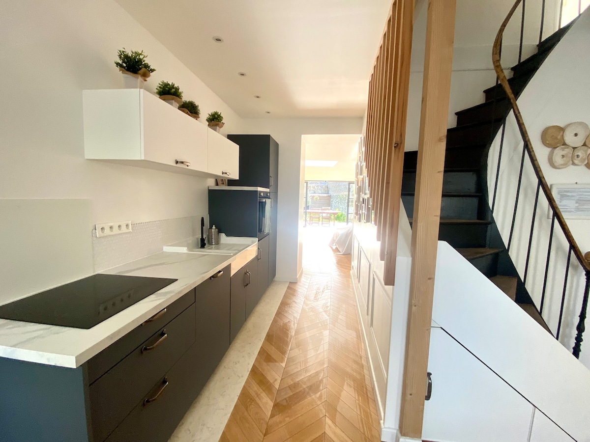 Maison de 70m2 en centre ville avec jardin à 100m de la plage. La maison dispose : - un séjour équipé d'une table en bois et chaises scandinaves - une cuisine équipée, plaque de cuisson, lave vaisselle, four, évier - un salon canapés, télévision, jeux de société, livres, grande table basse - une salle de douche - wc, laverie avec une machine à laver, fer à repasser A l'étage : - une chambre avec lit double 160x200, armoire, penderie, bureau - une chambre avec un lit triple 90x190, armoire