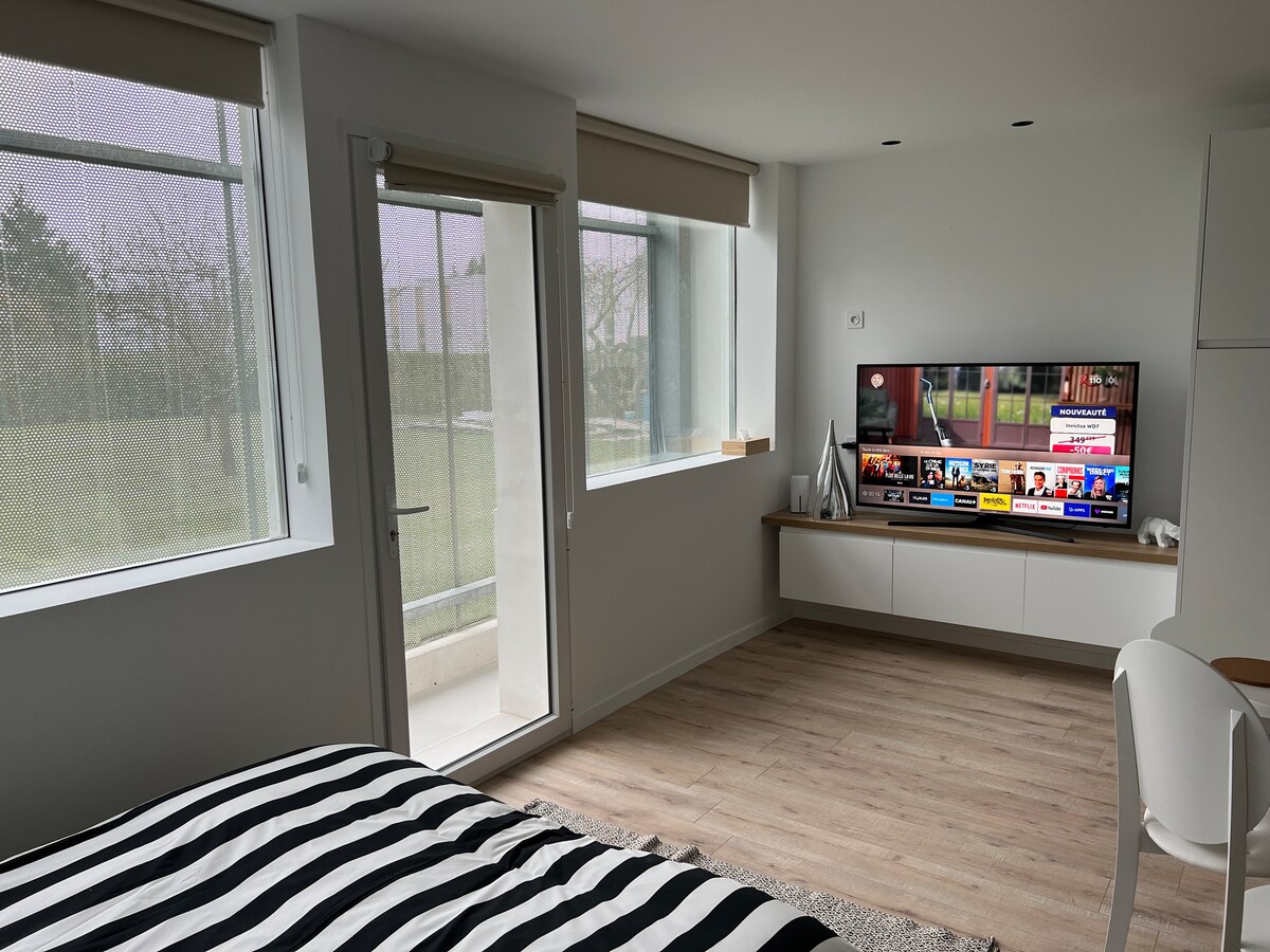 Nasze odnowione studio o powierzchni 22 m2 znajduje się w samym sercu ogrodów Serres Angevin, 10 minut od Angers, 10 minut od brzegów Loary, 5 minut od tramwaju. Specjalnie na wypadek upałów, znajdziesz tu aneks kuchenny i przyjemną jadalnię. Łazienka z prysznicem i toaletą. Dostęp do Internetu i Wi-Fi. Nowa pościel Przestrzeń na zewnątrz z stołem i krzesłami, aby cieszyć się pięknymi dniami Bezpłatny parking Możliwość wypożyczenia rowerów Przywiązujemy szczególną wagę do czystości i gościnności