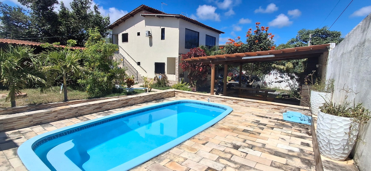 1 quarto de solteiro com 2 camas (de solteiros) 3 suítes de casal, todos com cama auxiliar de solteiro. 1 banheiro social 1 sala ampla para 3 ambientes cozinha toda equipada área gourmet completa Pequena área verde com sofá Churrasqueira A casa é de esquina, frente piscina natural, parquinho, salão de festa e estacionamento. O condomínio tem sauna, piscina aquecida, quadra de vôlei, futvôlei, mini campo de futebol, segundo salão de festa, rio com permissão para pesca artesanal e muito mais