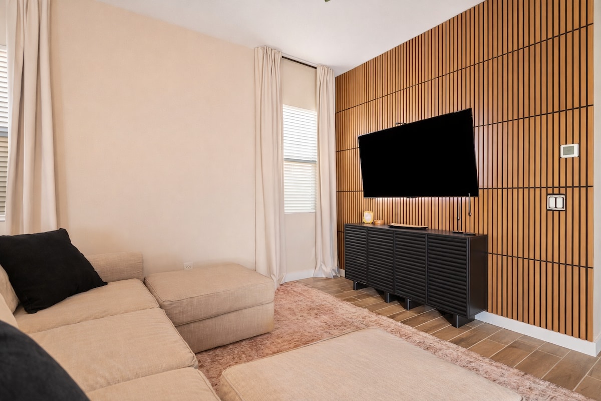 Przestrzeń: Witamy w Palm Paradise, Twoim relaksującym miejscu wypoczynku w samym sercu Starego Miasta Scottsdale. Odnowiony w październiku 2024 r. apartament łączy stylowy pustynny design z wszystkimi udogodnieniami domu, tworząc przestrzeń, która jest zarówno piękna, jak i funkcjonalna. Odpręż się na wygodnej kanapie z zielonego sztruksu, idealnej na drzemkę, lub wyjdź na prywatny balkon, aby podziwiać spektakularne widoki na Camelback Mountain. Wejdź do spokojnej sypialni z łóżkiem typu king-size i wysokiej jakości pościelą.