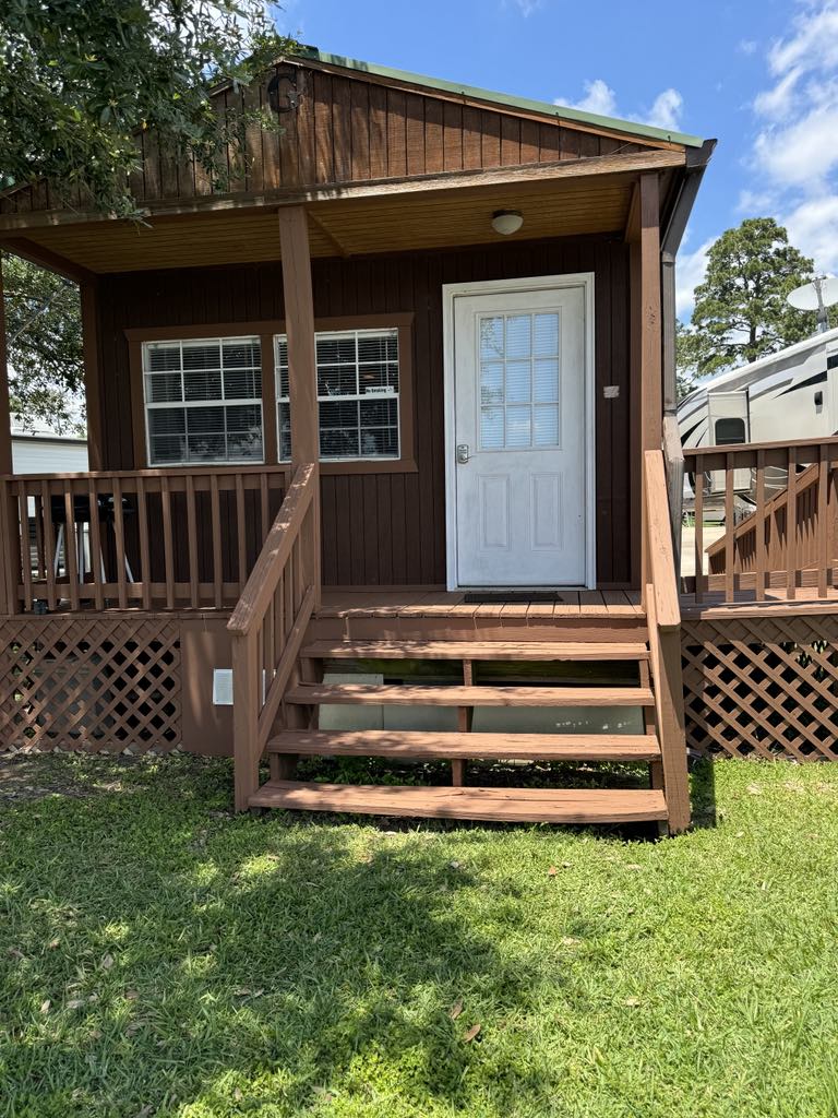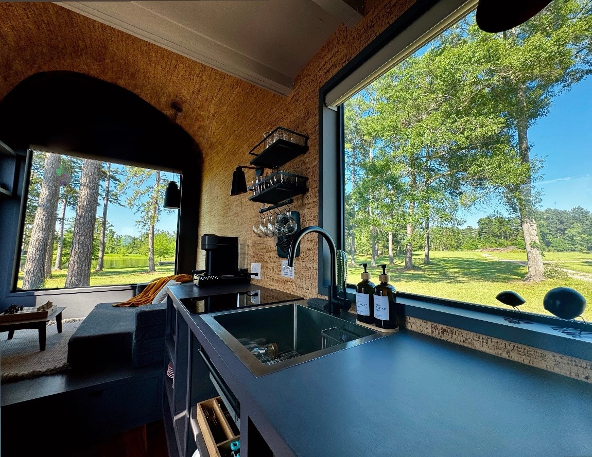 The simplicity & relaxation of our premium 399 Sq. Ft. tiny home is so refreshing and unique. This home sleeps four. It has a Queen size bed and a luxury pullout Queen sofa. The fully equipped kitchen is perfect to fix up your gourmet meals. The Bluebonnet is nestled beside our glistening 1/2 acre pond with ducks, fish and a fountain. A wooded area behind and open fields out front brings a nice breeze across the porch. Makes for a perfect place to enjoy the Big Texas Sky!