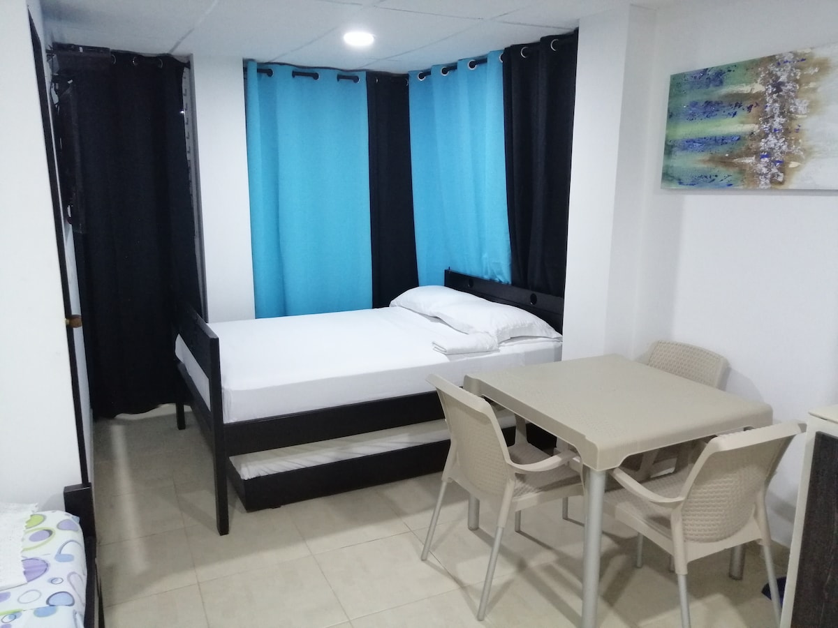 Przytulny apartament w odległości pół przecznicy (30 m) od najlepszych plaż San Andrés, w centrum wyspy. Posiada podwójne łóżko, pojedyncze łóżko pomocnicze pod podwójnym, w pełni wyposażoną kuchnię gazową ze wszystkimi przyborami do gotowania i serwowania, telewizję kablową, kuchenkę mikrofalową, lodówkę, klimatyzację, szafę i prywatną łazienkę. Apartament posiada małe okno obok kuchni z widokiem na wnętrze budynku. Powierzchnia 20 m2