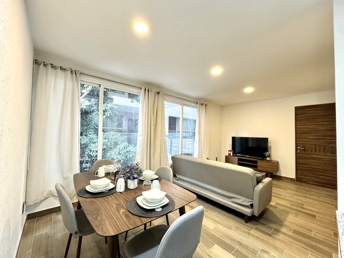 Mieszkanie na parterze w Coyoacán, zaledwie 7 minut od Jardín Hidalgo (Centrum Historyczne). Blisko UNAM i Muzeum Fridy Kahlo, w otoczeniu muzeów, kawiarni i tradycyjnych targów. Duża, ciepła i dobrze wyposażona przestrzeń, idealna dla rodzin i pracy zdalnej. Dwie sypialnie, salon/jadalnia z rozkładaną sofą, w pełni wyposażona kuchnia i prywatne patio. Bezpieczna okolica, samodzielne zameldowanie, zwierzęta mile widziane i wszystko, czego potrzebujesz, aby czuć się jak w domu od pierwszego dnia.