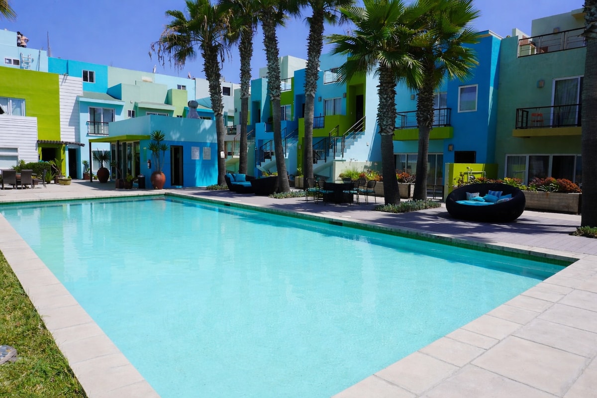 Przestronny apartament typu studio w wielopoziomowym domu na plaży w San Antonio Del Mar, 3 przecznice od plaży. Wewnątrz salon, kuchnia i pralnia. Jadalnia dla 4 osób, prywatny taras z dodatkową jadalnią i wspólny taras na dachu z grillem, paleniskiem i wspaniałym widokiem na ocean. Piękne artystyczne akcenty; niestandardowe elementy z kutego żelaza, żywe murale. Miejskie współistnienie. Bezpieczna i ogrodzona społeczność, ochrona 24/7, wspólne baseny, korty tenisowe i park z placem zabaw. Szybkie Wi-Fi. Nocleg dla 4 osób.