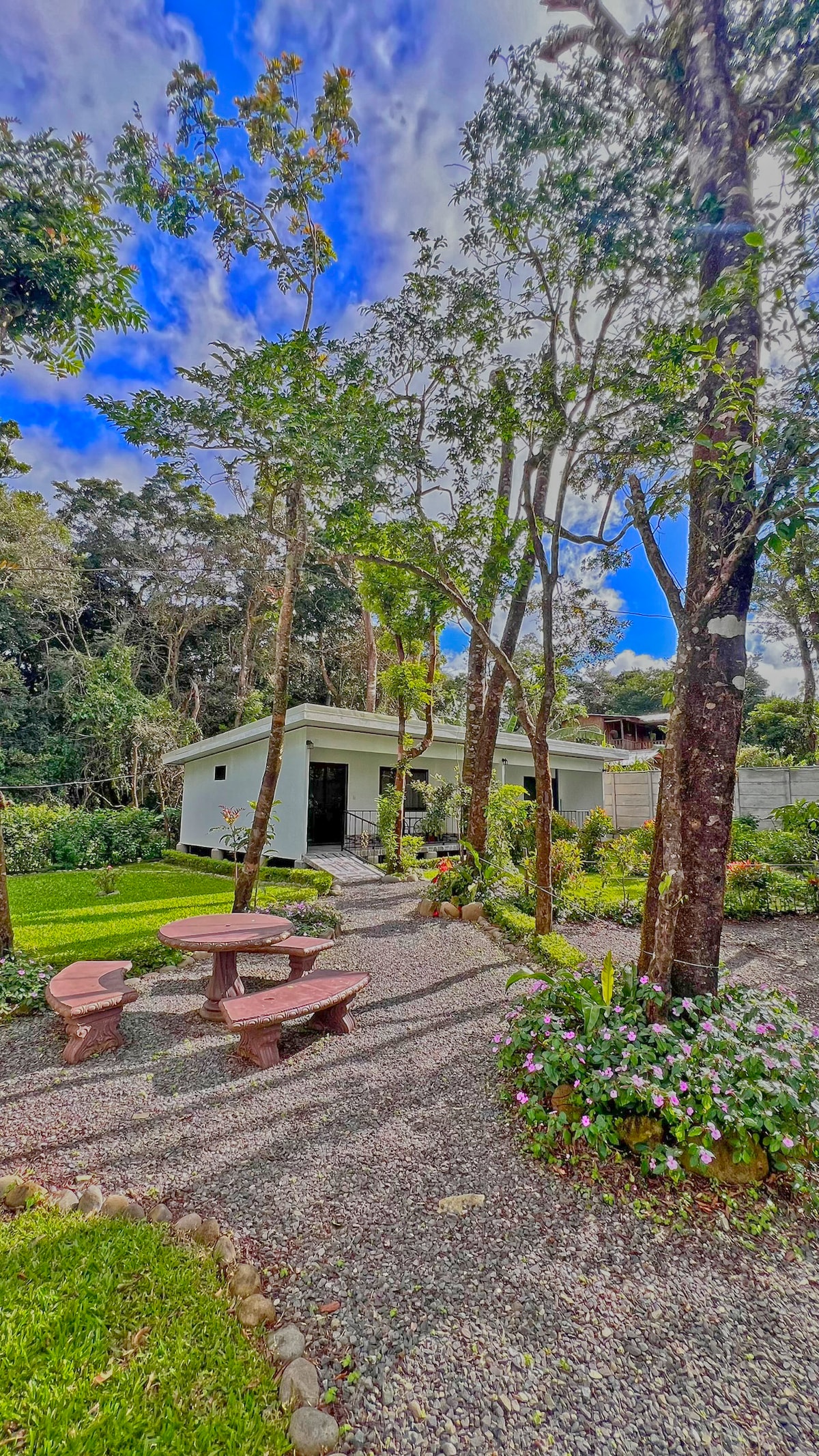 This uniquely designed studio is 1 of only 7 exclusive apartments in La Fortuna, just 3 blocks from downtown yet tucked away from noisy streets. Perfect for couples or solo travelers, it features a KING bed, A/C, high-speed WiFi +200mbps, kitchenette, Smart TV and full bathroom. Outside, unwind in your private JACUZZI or savor magical sunsets from the rooftop terrace with breathtaking volcano views 🌋💫.