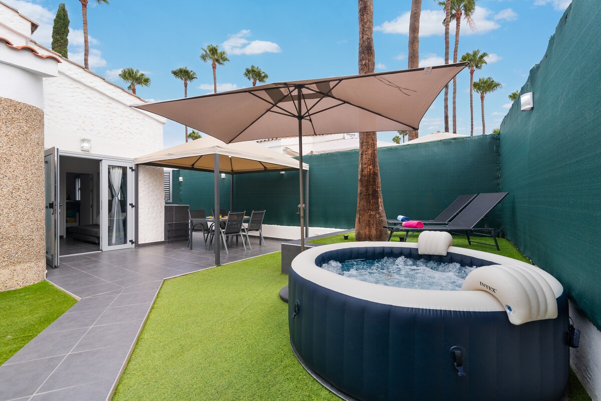 Bungalow Jacuzzi PDI Terraza znajduje się w Playa del Inglés, zaledwie 0,5 km od Playa del Inglés. Oferuje zakwaterowanie z ogrodem, tarasem, barem i bezpłatnym WiFi. Oferuje balkon i odkryty basen. Ten klimatyzowany domek składa się z 1 sypialni, salonu, w pełni wyposażonej kuchni ze zmywarką i ekspresem do kawy oraz 1 łazienki z prysznicem i wanną z hydromasażem. Do dyspozycji gości są 2 telewizory Smart TV z płaskim ekranem. W bungalowie dwupoziomowym goście mogą korzystać z prywatnej wanny z hydromasażem.