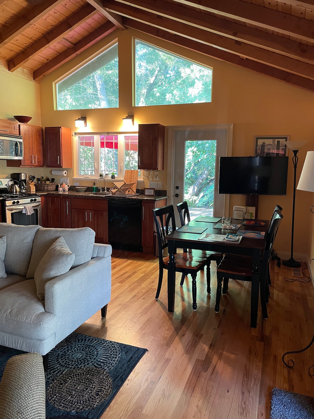 Nowa konstrukcja, jeden poziom, brak schodów do wejścia z ulicy. Prywatny, cichy domek gościnny. Dużo bezpłatnych miejsc parkingowych na ulicy w odległości jednej przecznicy. Wejście bez klucza. 450 stóp kwadratowych, ale wydaje się większe. Łóżko typu queen, duża szafa, w pełni wyposażona kuchnia, duża łazienka, prywatny taras. Bezpłatne telewizory W/D. 2-55"z antenami cyfrowymi +Roku. Stół kuchenny pełni funkcję biurka. Bez opłaty za sprzątanie. Nasza rodzina bawi się na wspólnym podwórku późnym popołudniem z 2 przyjaznymi psami. 7-28 dni. Dla dwóch gości wybierz „2” podczas dokonywania rezerwacji.